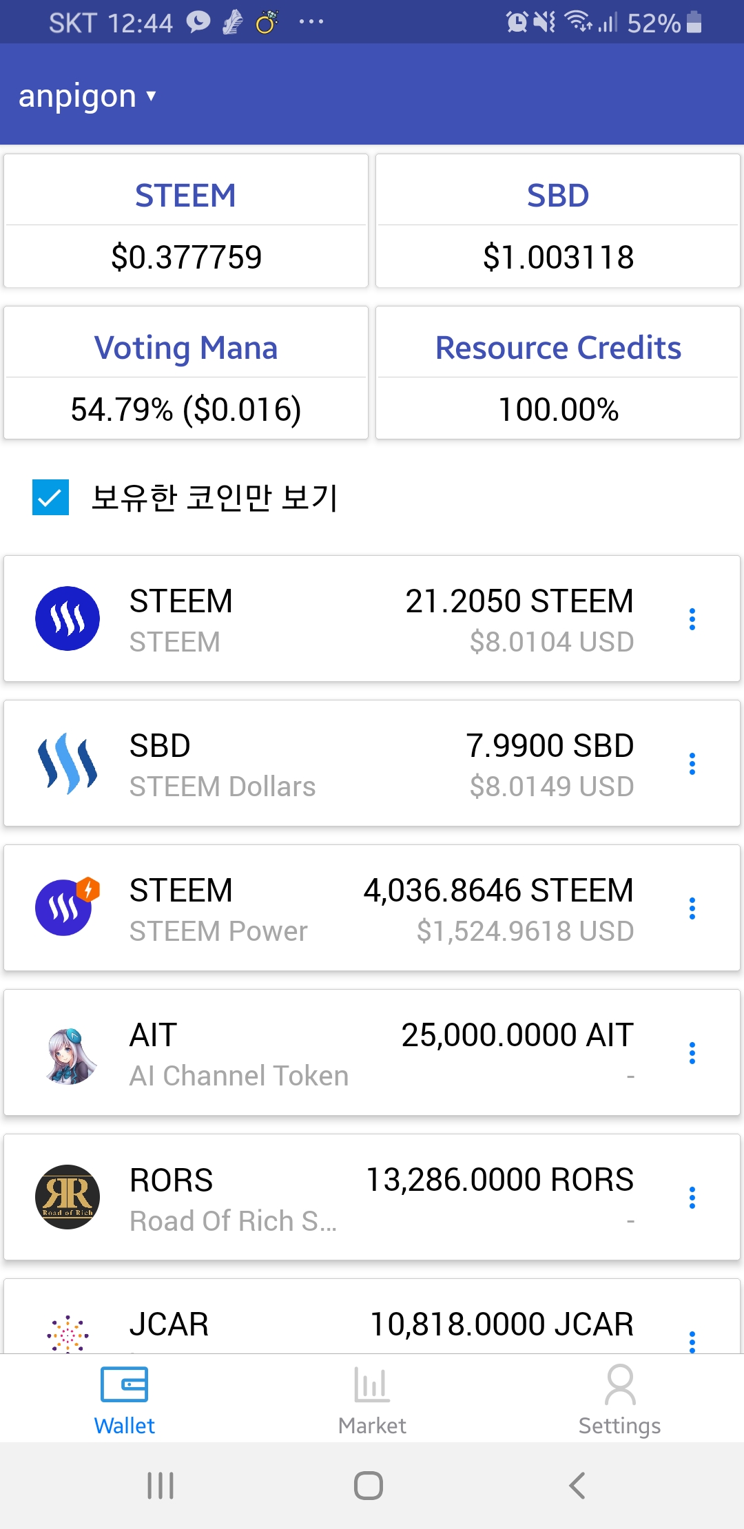 지갑 목록 화면에서 스팀, 스팀달러, 스팀파워, 그리고 스팀엔진 토큰 잔액을 보여줍니다. 그리고 부기님(gfriend96) 요청으로 보유 코인만 보기 옵션을 추가했습니다. STEEM과 SBD 가격은 코인마켓캡 API를 이용하였습니다. 새로고침(Refresh)은 끌어당김(Pull Down)으로 동작합니다.