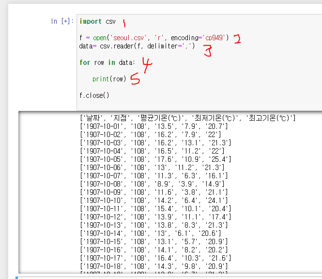 (import csv는 csv란 라이브러리를 불러오는 실행문이고, csv.reader는 csv라이브러리에서 reader라는 함수를 실행한다는 의미)open함수로 특정 csv파일을 연다. 그리고 함수값을 f변수에 담는다. (아마 메모리에 csv파일을 띄우고, 그 주소를 f변수에 넣는것일게다. 여기서 f는 파일 핸들러라 부른다.)