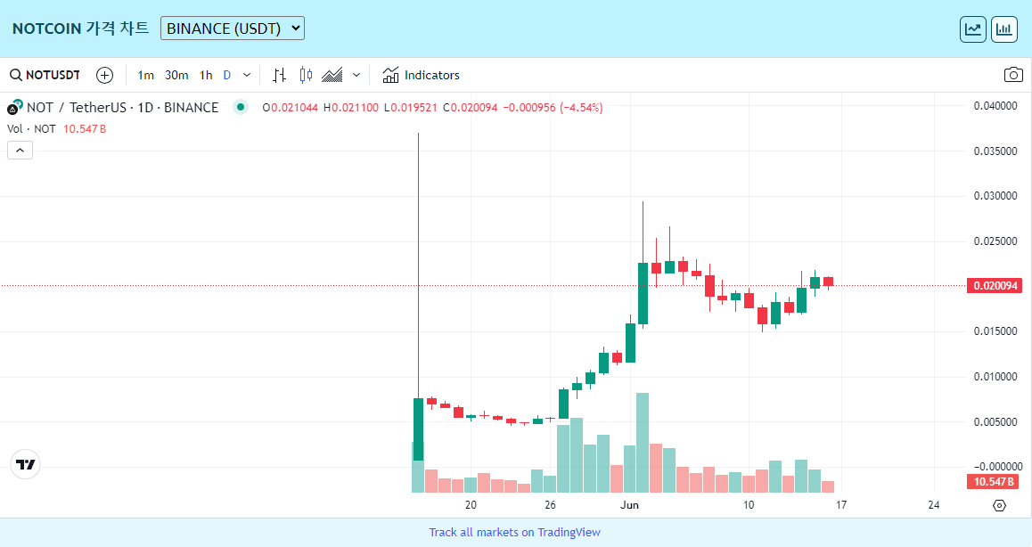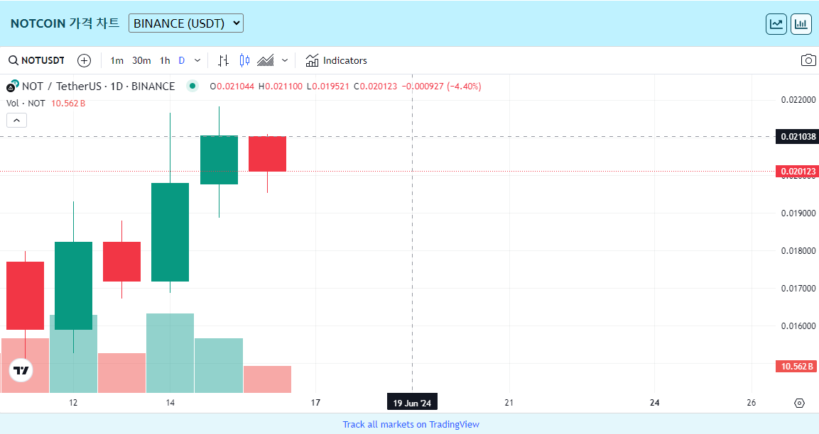 6/17일 아침 NOT코인의 현황ariana123 (53)in #kr • 2 years ago 현재의 NOT코인의 현황 현재는 그렇게 좋지 않은 모습을 보이지 않는데 그래도 0.02$는 꾸준히 유지되고 있습니다. 단기적인 방향에서는 이 0.021$만 넘으면 0.025$로도 갈 수 있을 것 같은데 한번 봐야 할 듯 합니다. 개인적으로는 올라서 한번 소고기 사 먹고 싶은 NOT코인 힘내라! 아자 아자 파이팅! 영차~ 영차~ 그럼 오늘의 NOT코인 일기 끝! #krsuccess #not #notcoin #altcoin #notchart