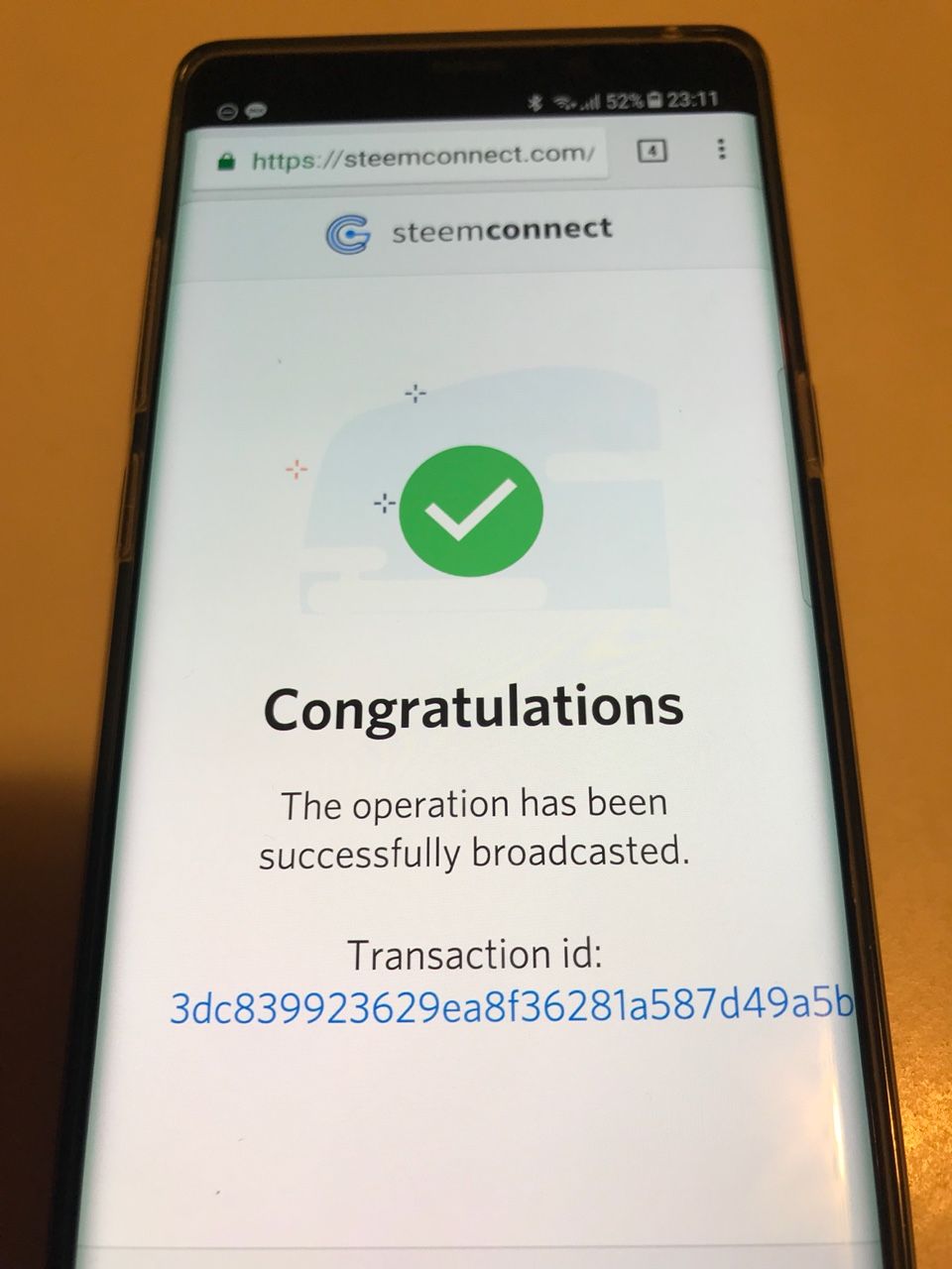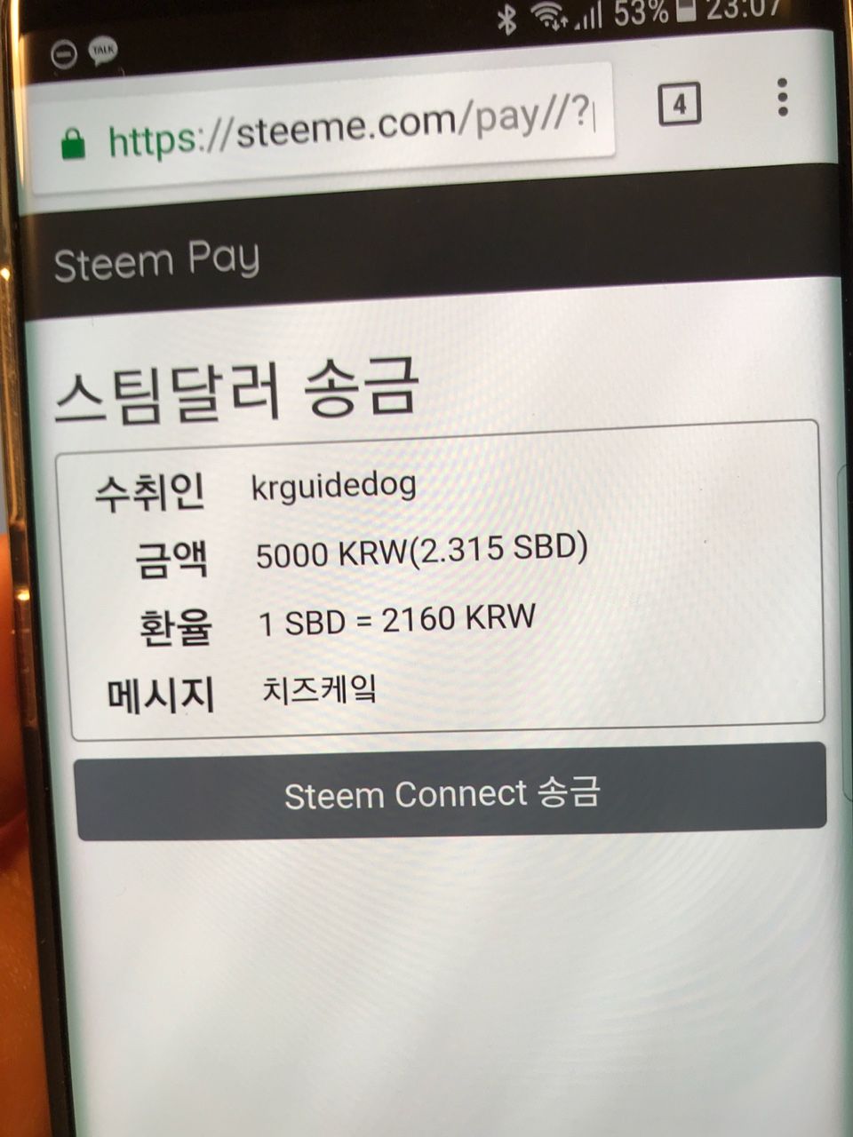 스팀페이 웹사이트가 열리며, 결제 상세 정보가 표시된다. 확인후 SteemConnect로 결제 버튼을 터치한다.