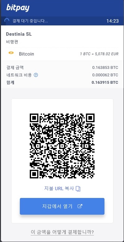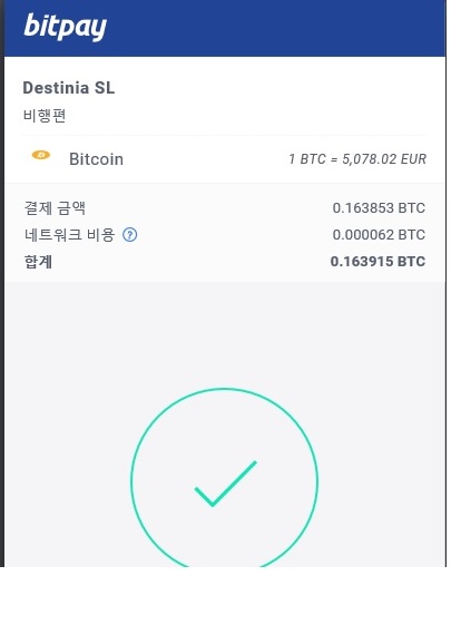 이렇게 이제 비트페이 지갑에 비트코인을 넣어둔 상태에서 Destinia에서 결제를 진행했습니다.