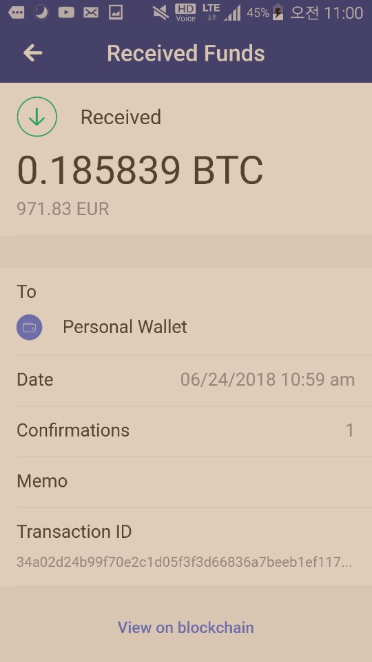 전송하고 한 5분정도 지나니 결제가 완료 되었습니다! 이때 제일 기뻤던 것 같습니다 ㅎㅎ! 많은 후기들을 보며 당연히 의심은 안했지만 그래도 뭔가 알 수 없는 긴장감과 두려움이 신기술에 대한 무지때문 일까요 아니면 제가 그냥 겁쟁이여서 그런건지! 모르겠으나 어쨌든 잘, 빠르게 전송되었습니다.