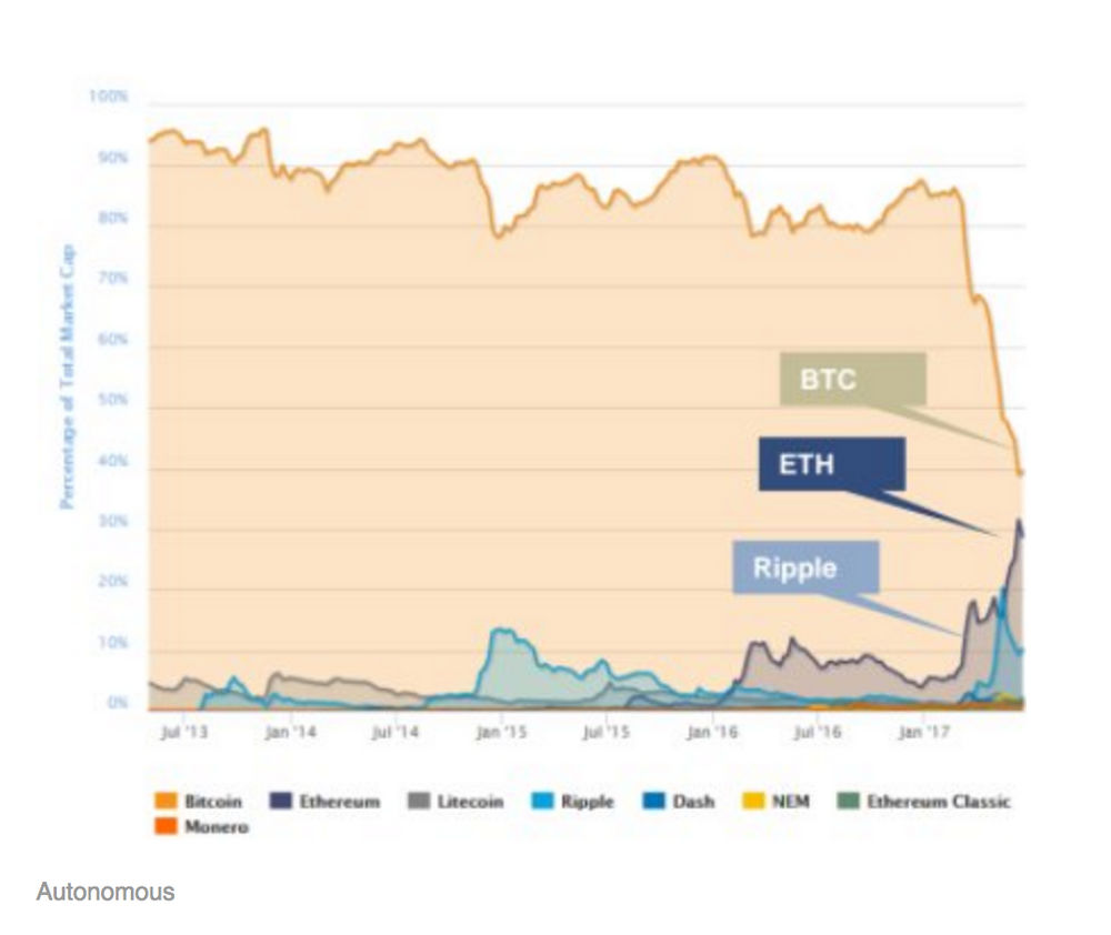 가상화폐 전체 시장의 움직임은 심상치 않아 보인다. 시장 전체 보유율 역전 시기가 더욱 가속화되고 있는 것이 아닌가 하는 것이다.