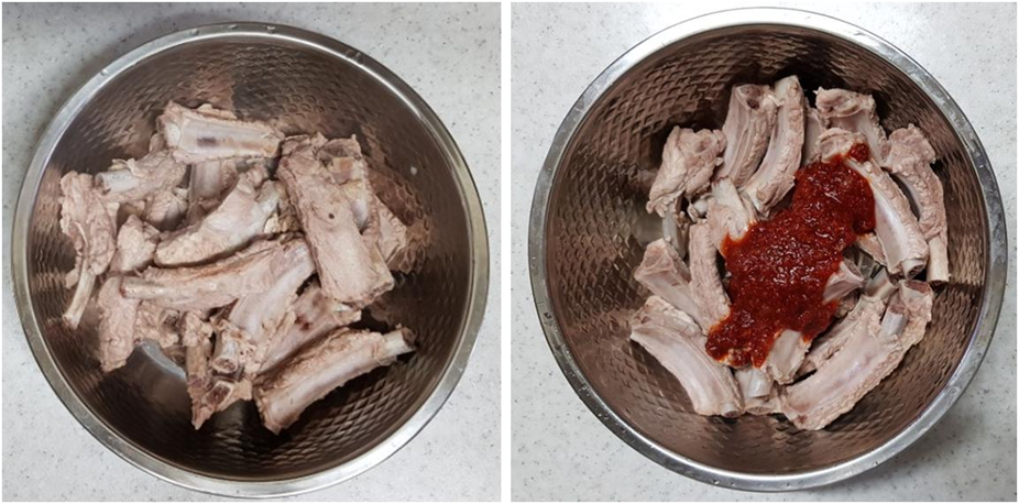 Step1. 등갈비를 적당한 크기로 잘라줍니다. 양념이 잘 베고 먹기 쉽도록 미리 칼집을 냈습니다.