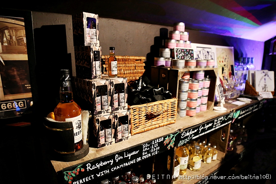 동굴 같은 기념품 샵에는 에든버러 진과 관련된 MD를 다양하게 판매 중이에요.