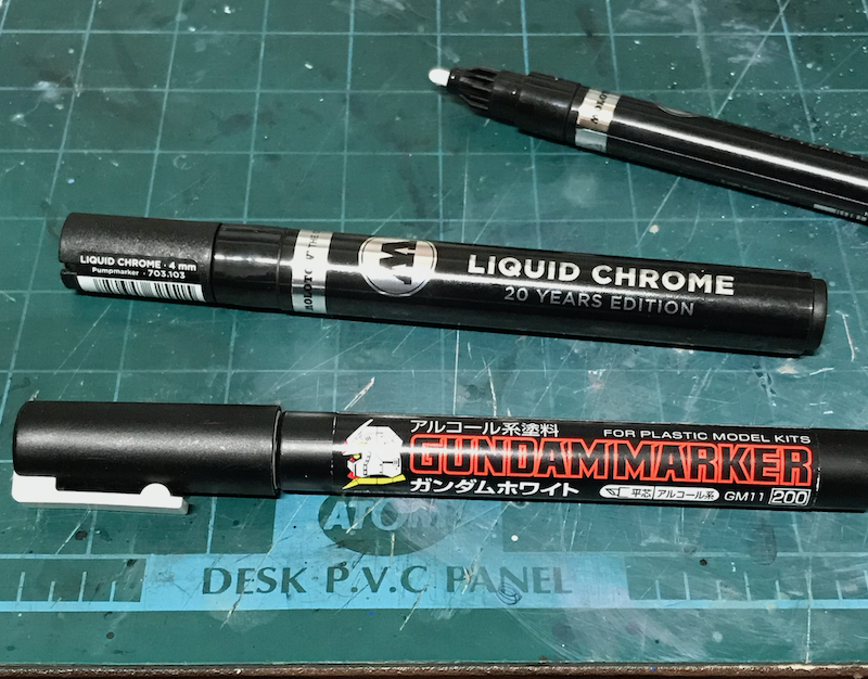 왼쪽이 막 칠한 상태의 모로토우 크롬마커, 오른쪽에 칠한게 건담마커 실버 입니다.