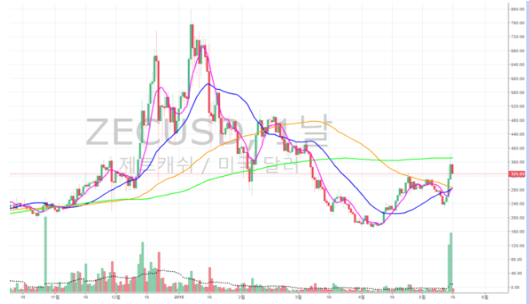 - 지캐시 상장 이슈로 급등 후 조정 횡보 하는 모습, 괄목할만한 거래량이 발생한 것이 특징