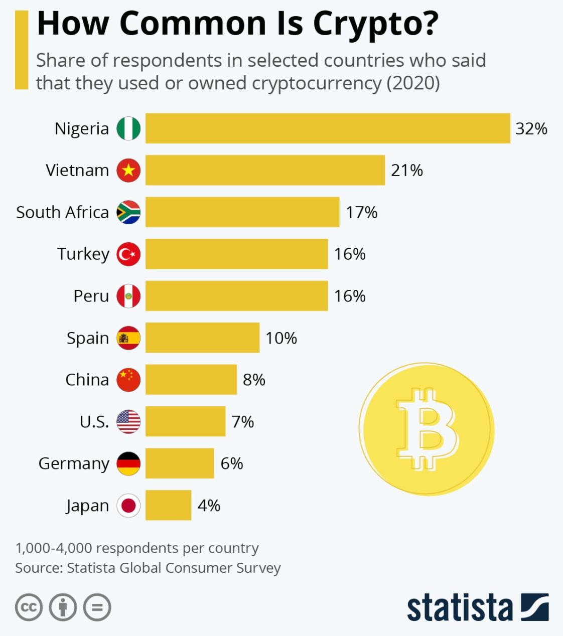 미국의 경우 7%에 불과하고 독일은 6%, 일본이 4%로 선진국의 비트코인 이용도가 낮은 경향이 있음을 알 수 있습니다.