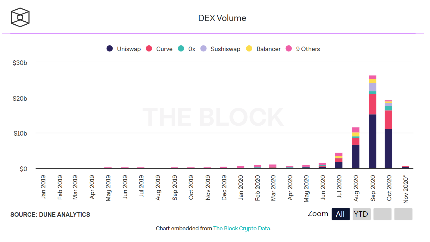 탈중앙화 거래소 10월 거래량 185억 달러..전월 대비 23% 감소