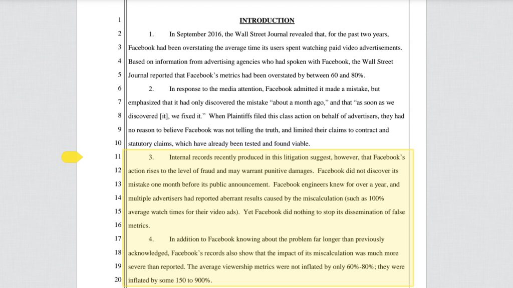 //지난달 16일 광고업체들은 ‘페이스북이 사용자 데이터를 과장해 제공했다’며 소송에 들어갔다. (image : 소송장)