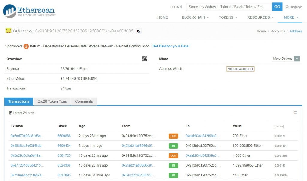 //실제로 이더리움 블록체인의 경우 주소끼리의 거래 내역과 지갑 잔고를 검색해 확인할 수 있다. (image : etherscan)