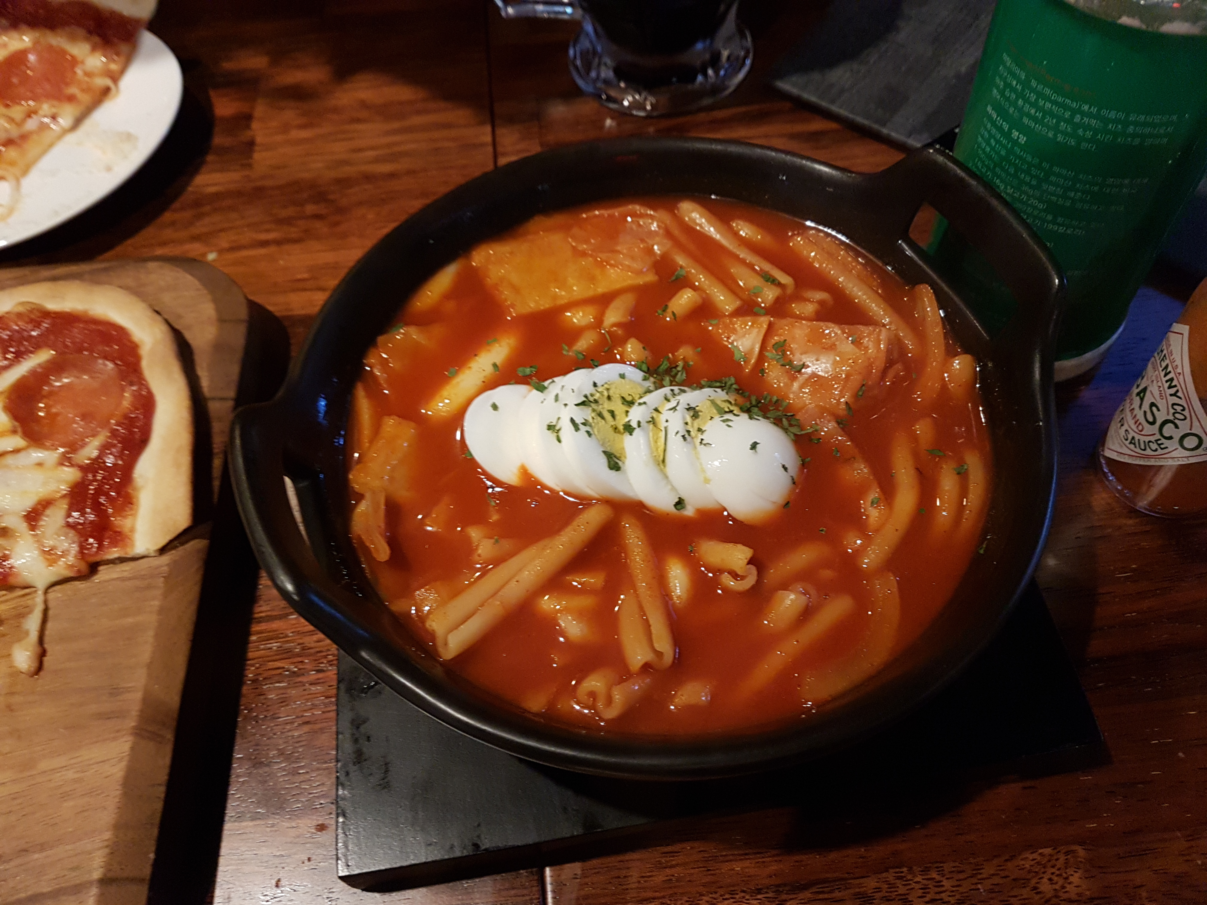 좀 매콤한 떡볶이도 시켰습니다. 떡대신에 말린 파스타로 요리했어요. 매운 게 피자랑 궁합이 좋았습니다.