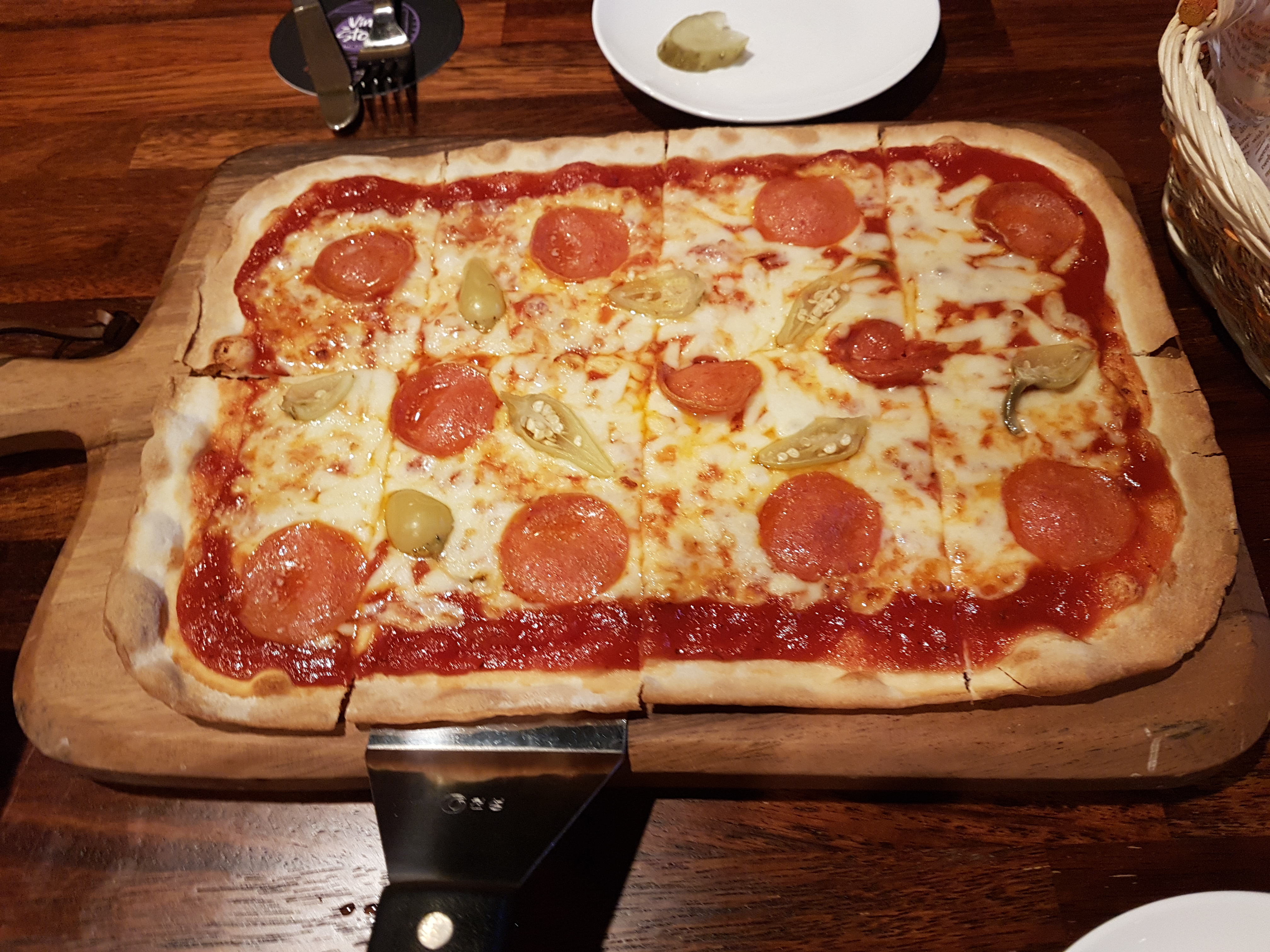 첫번째 안주는 페페로니 피자입니다. 맛은 평범하거나 그보다 조금 나은 정도입니다. 가격이 조금씩 싼 대신에 안주 양은 적습니다. 다른 메뉴를 주문할 기회가 생긴 셈이죠.