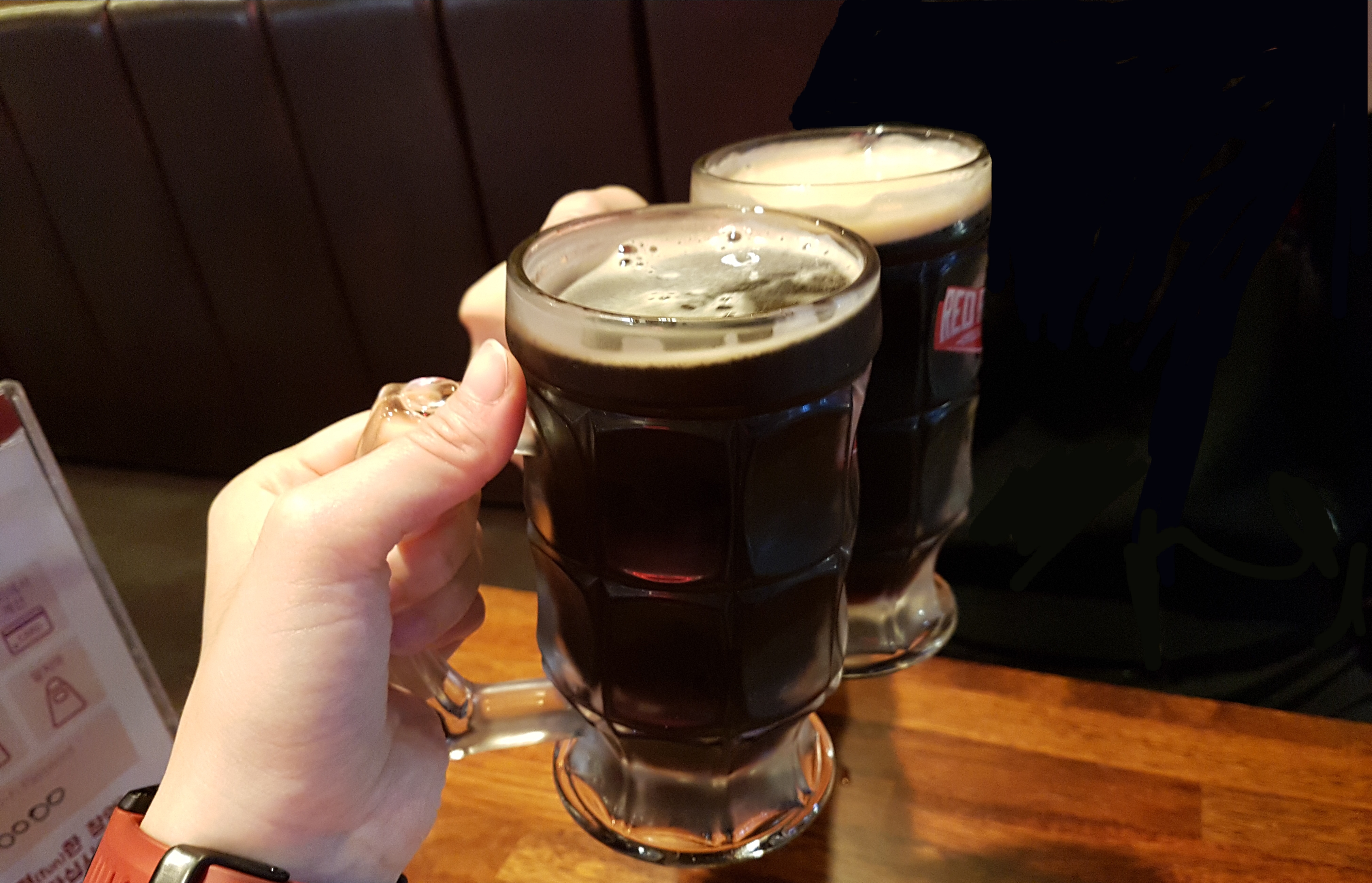일단 메뉴를 시키기전에 맥주 한잔 짠! 개인적으로 흑맥주를 좋아하는데 먹을만 합니다. 가격대비 괜찮은 맛이예요. 1잔에 500ml는 안되고 대략 330~400ml 정도 됩니다. 잔이 작아보이지 않는데 좀적게 들어가는듯 근데 4,900원!! 아주 합리적인 가격이예요.