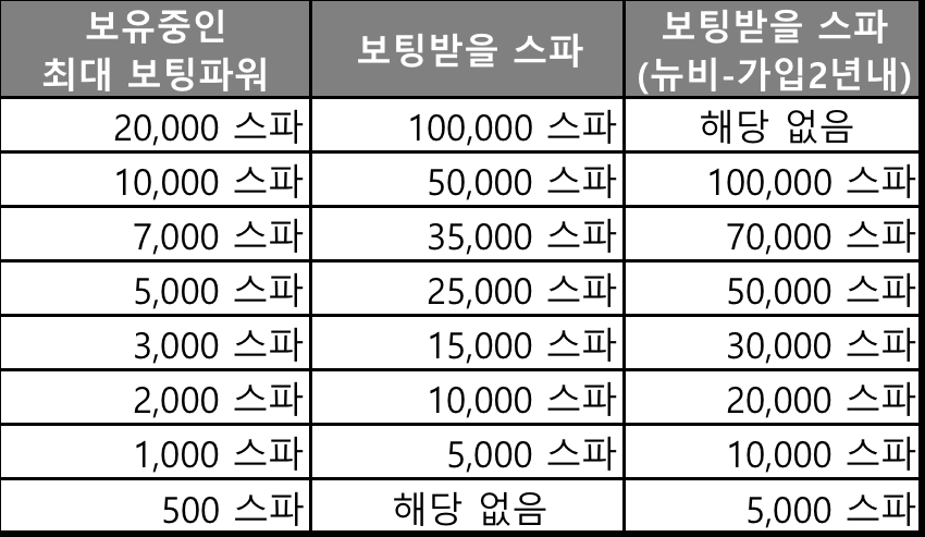 여기서, 보팅파워 = (본인의 스파) + (임대받은 스파) - (임대보낸 스파) - 혜택을 받을 수 있는 최대 보유 보팅파워는 20,000스파입니다. (뉴비는 최대 10,000 스파까지만 인정)