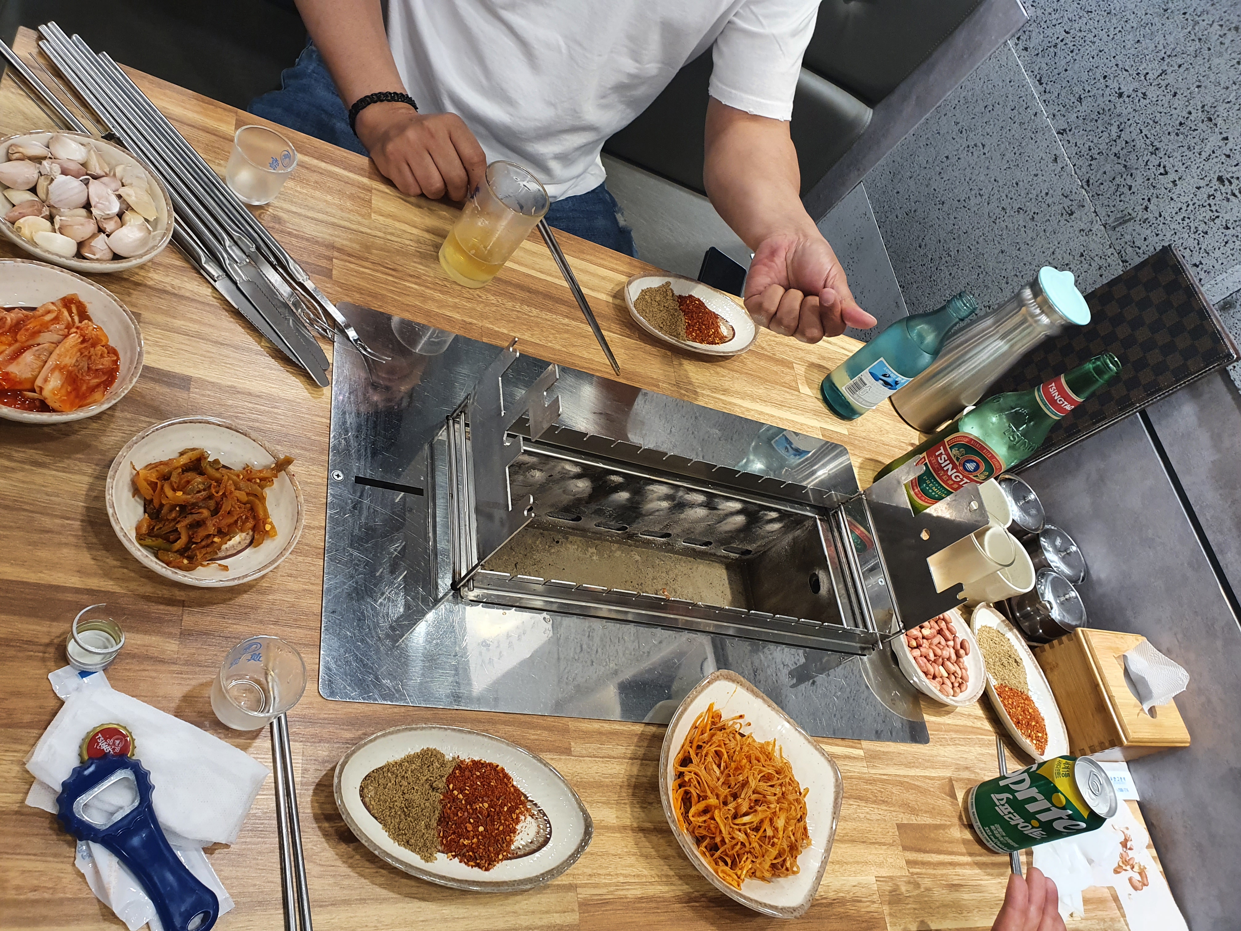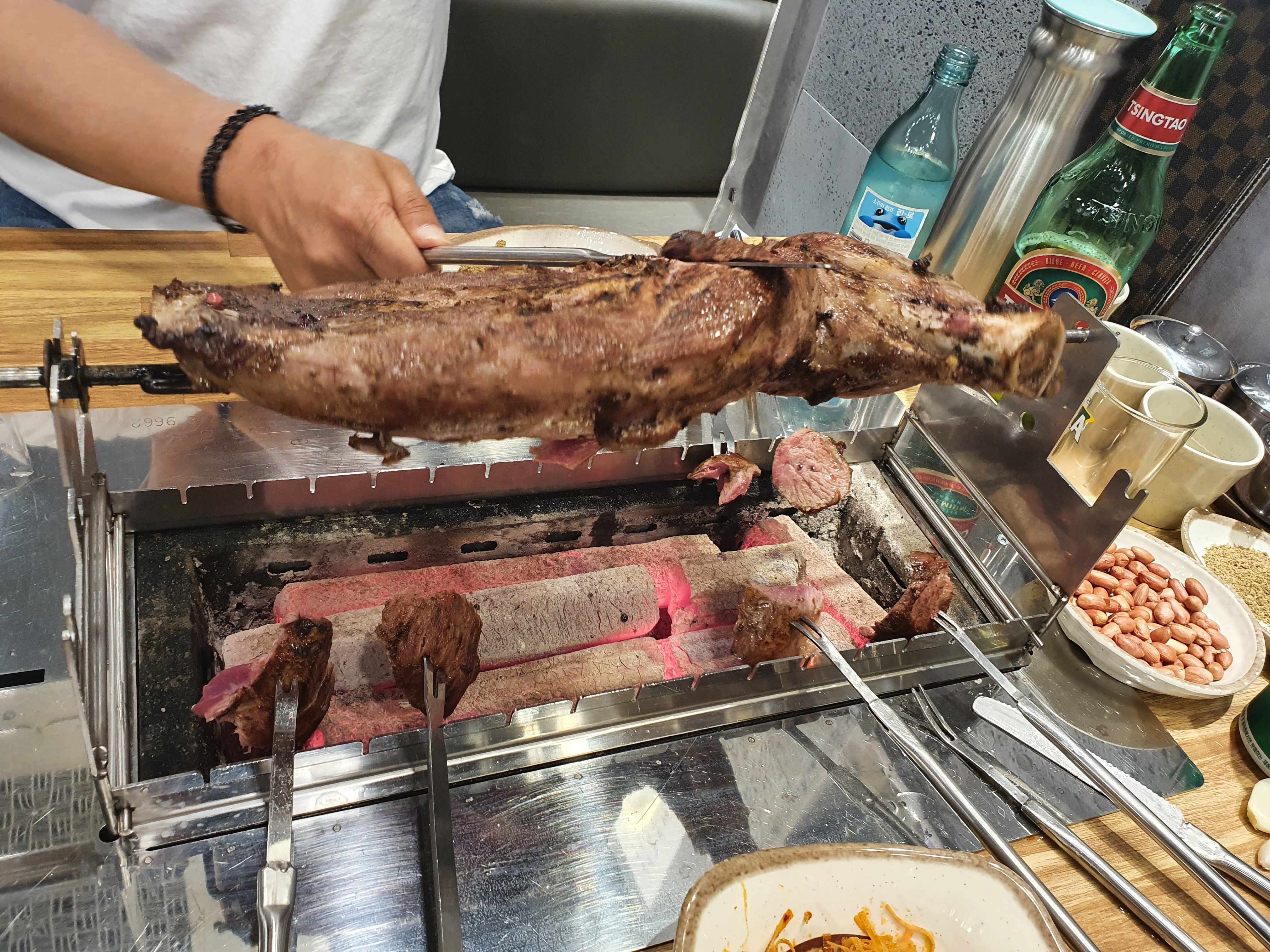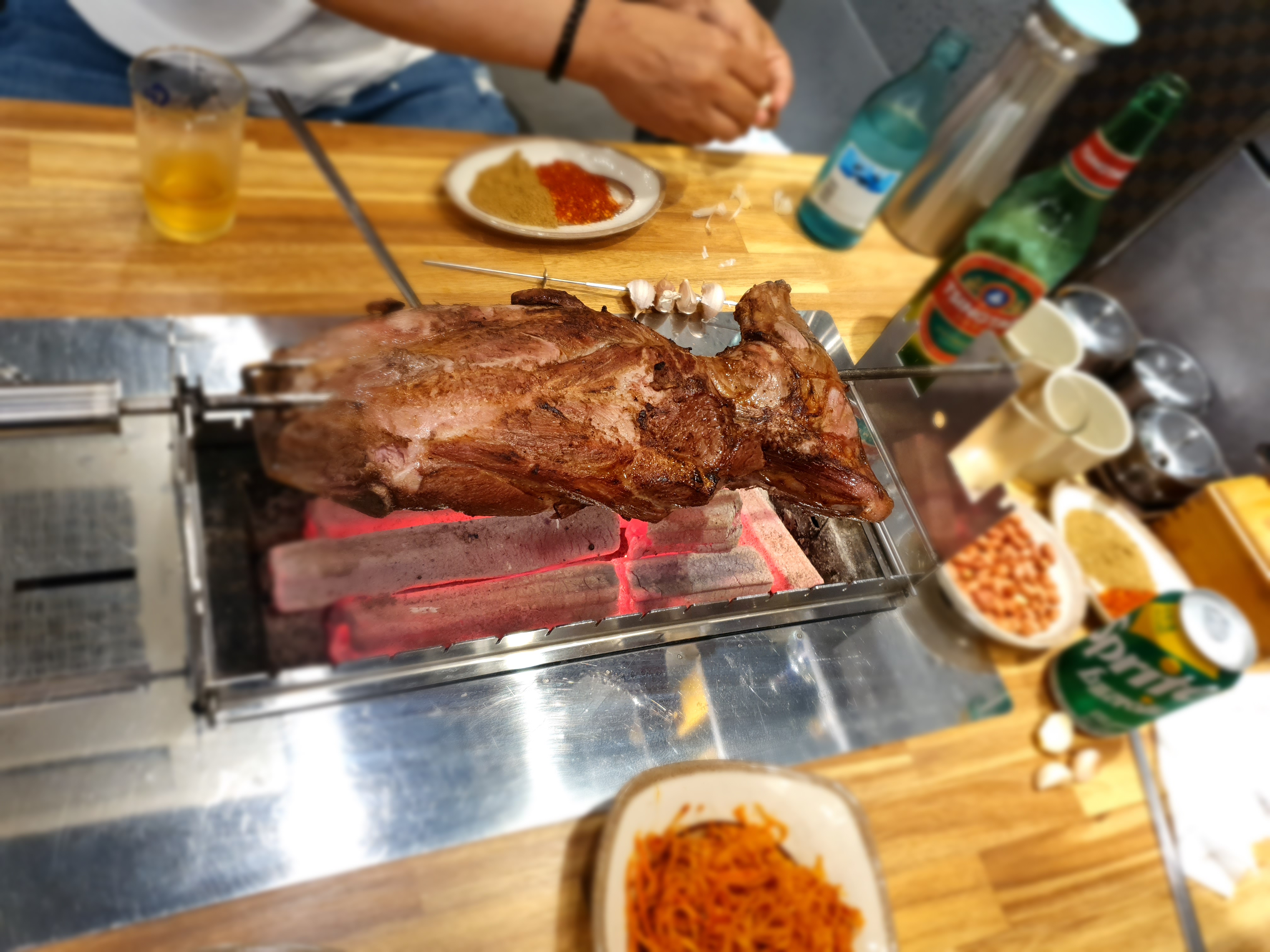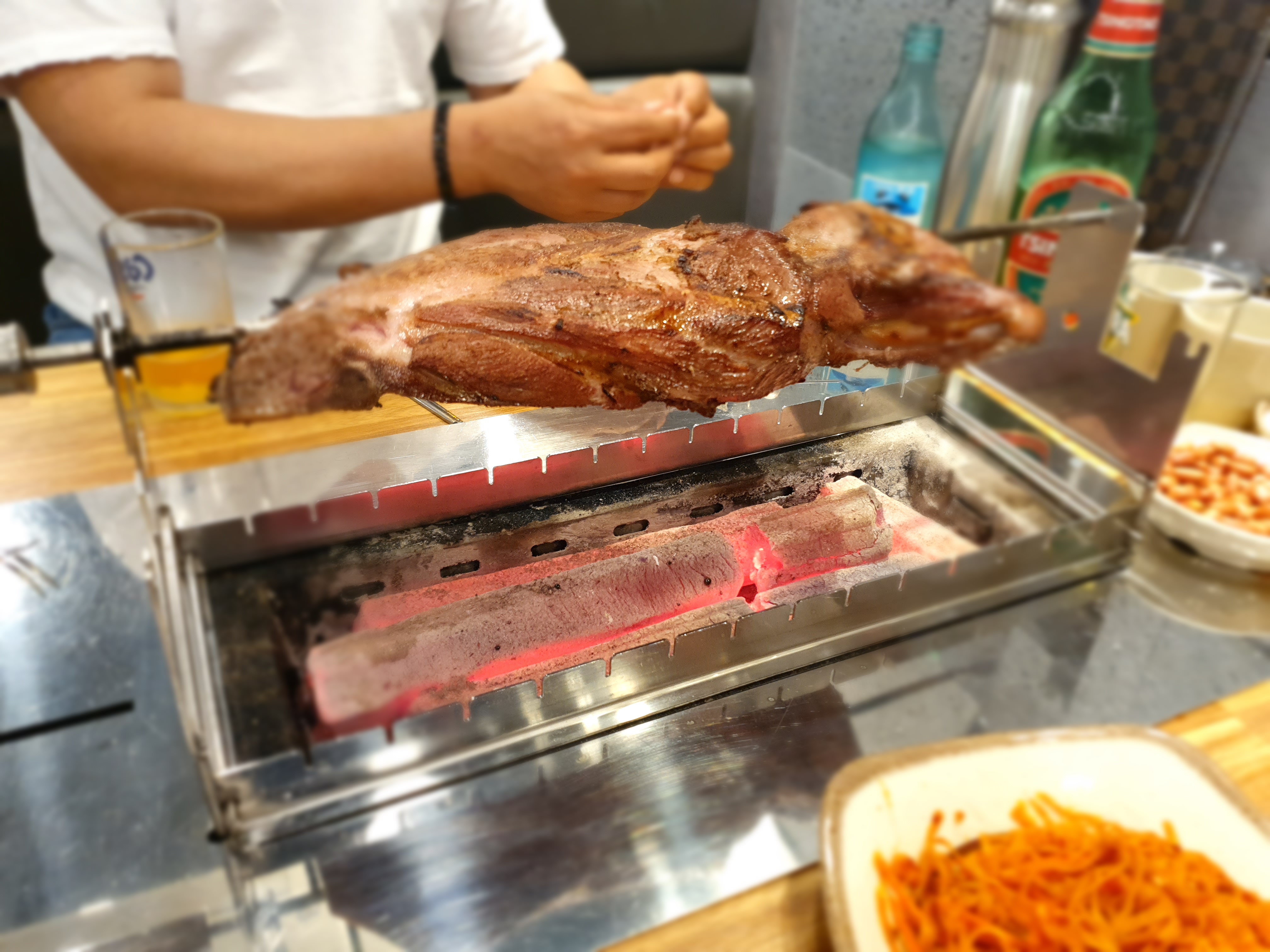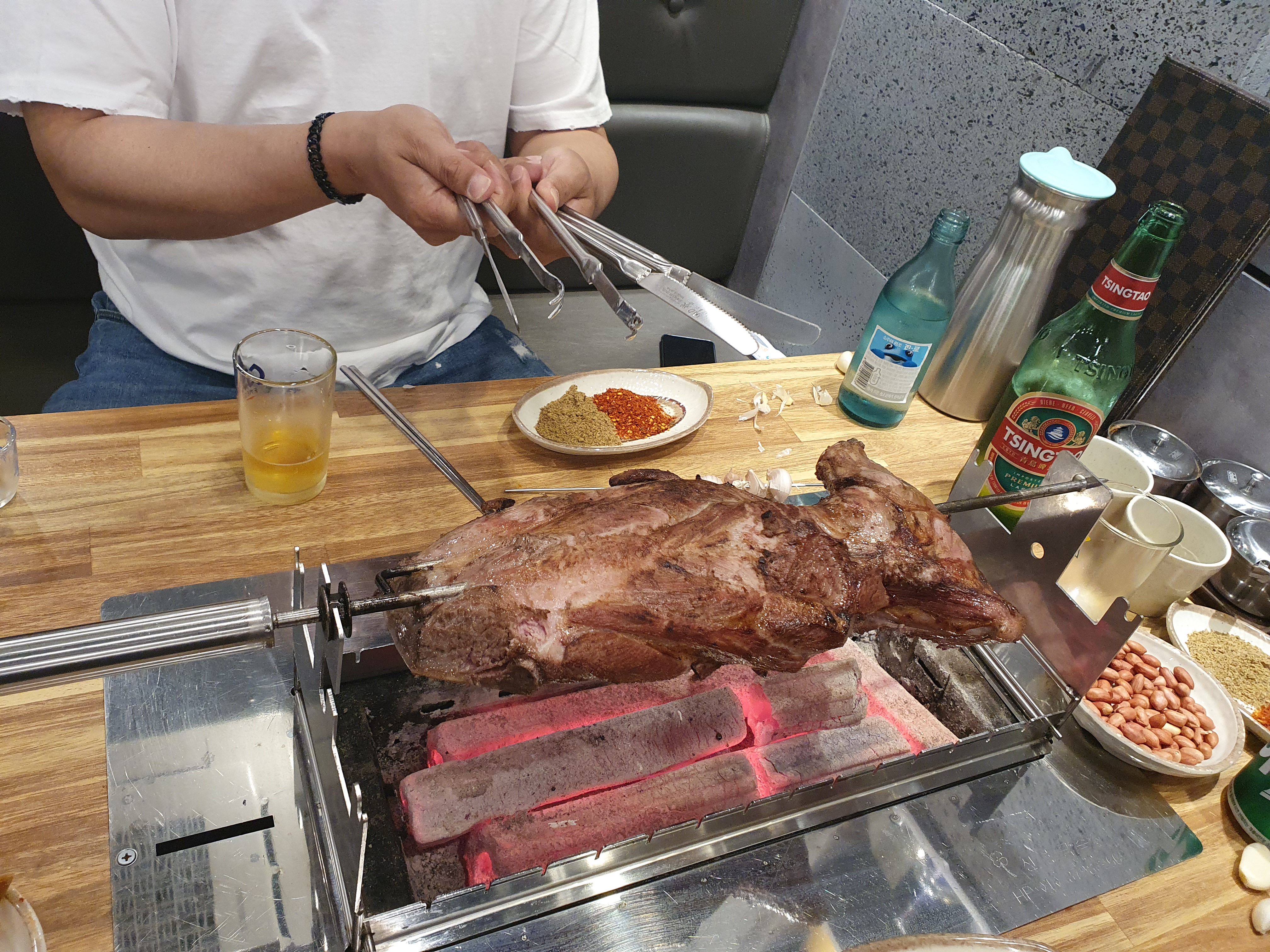서울에 차이나타운(?) 가리봉 양다리 구이집..steemCreated with Sketch.brackf2 (53)in #kr • 6 years ago 몇일전부터 친구가 너무 맛있는 양다리 구이집이 있다고 입에 침이 마르도록 얘길해서 맛보러 서울에 갔다..장첸이 나올것같은 분위기에 꼭 중국에 온것같은 느낌이였다.. 줘마라는 양다리구이집인데 줘마라는뜻이 천사(?)라는 뜻이라고 들었다..맞나? 상이 차려지고 2kg보다좀큰 다리구이와 바지락무침을 주문했다. 진짜 소고기 저리가라하는맛이다.. 새콤달콤 바지락무침도 별미..궁합이 잘맞네요.. 비쥬얼에 한번 맛에 한번.. 꼭한번 드셔보세요.. #ko #steem #zzan #tasty