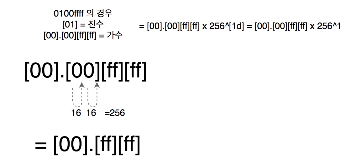 여기서 bits가 제시하는 숫자의 계산법은 00.00ffff*256^1d 입니다. 만약 지수가 01이였다면 256^1로 소수점이 우측으로 한칸 움직인 00.ffff가 됩니다. (* 여기서 주의할 점은 16진수이므로 16당 1칸이라 생각하면됩니다.)