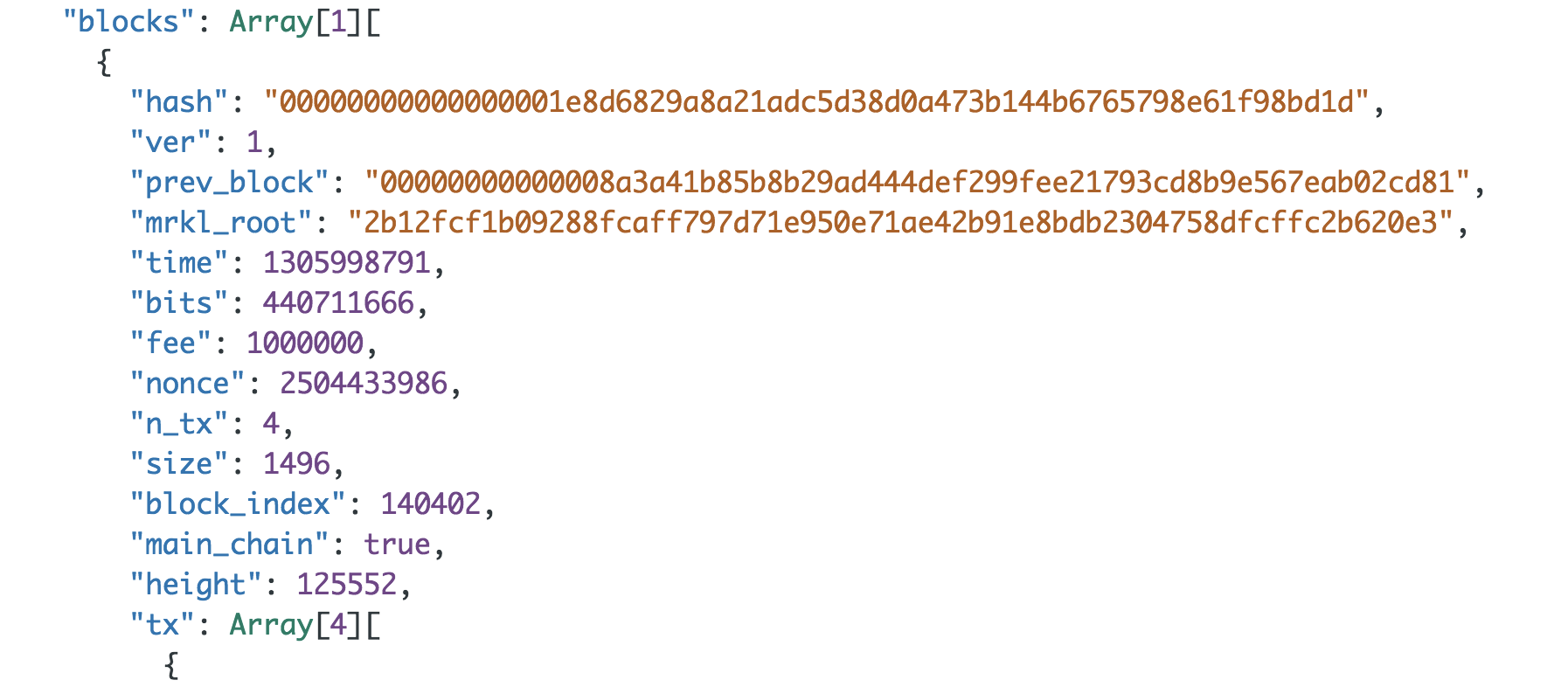 위 URL처럼 정보를 구성하여 요청하면 125552번째 블록 정보를 JSON 형태로 제공받을 수 있습니다. 참고로 위의 URL의 /125552? 이 부분에 숫자 부분이 블록 높이 정보입니다. 다른 블록을 확인하고자 할때는 원하는 블록 높이 값을 입력하여 호출하면 됩니다.