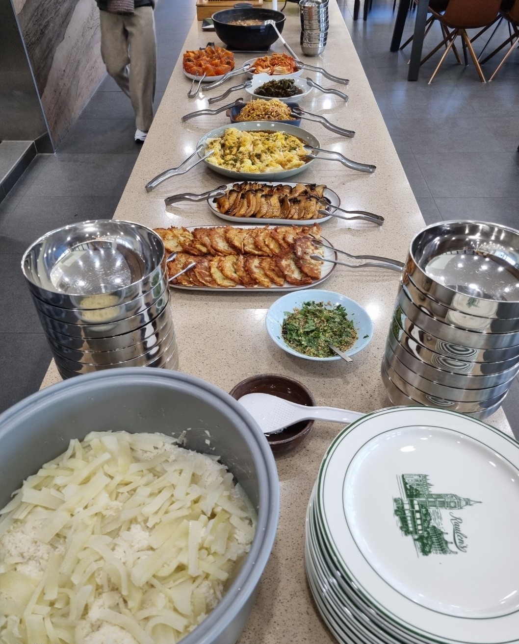 아름다운절 녹야원buli713 (58)in #kr • last year 첫째주 토요일은 화엄경 공부하는 날이다. 10시부터 예불을 드리고 점심 공양이 끝나면 잠시 휴식 후 다 같이 화엄경 공부한다. 오늘 식당에 차려진 점심 공양이다. 맛있는 무밥에 감자전, 새송이조림, 배추찜, 콩나물, 장아찌, 김장김치, 청국장찌개, 후식으로 음료와 과일, 떡이 있다. 많이 먹은 탓에 휴식 시간에는 주변을 둘러쌓고 있는 산 자락을 오르내렸는데 밥 먹으로 절에 왔나 싶었다. 그래도 맛있었다. #krsuccess #buddha