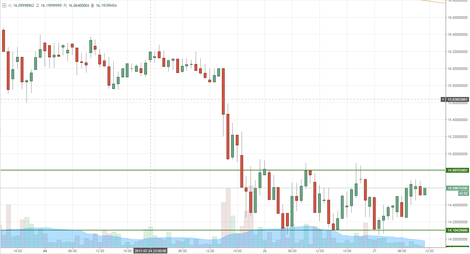 이더도 횡보라인을 그리는듯 보이네요 ~ 어느 카톡방에서 약간의 이더호재?소식을 듣긴했는데 별다른 반응을 보진 못하겠군요 ㅠㅠ