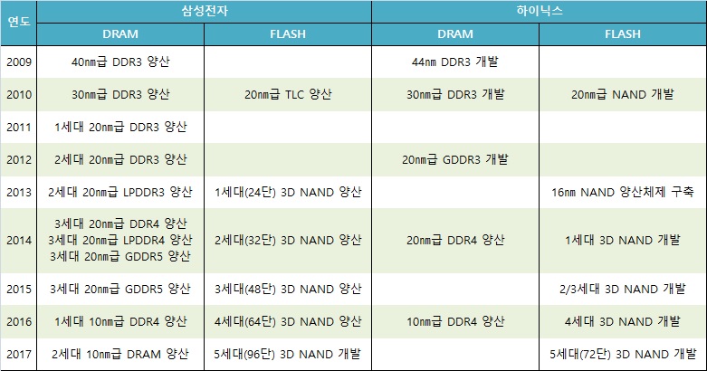 내년에 중국에서 양산할거라는 DRAM은 30나노급 제품입니다. 아래 표에 따르면 삼성전자와 SK하이닉스에서 2010년에 이미 양산을 시작한 제품이라고 보면 됩니다. FLASH는 32단 3D NAND로 알려져 있는데, 국내 업체는 2014년에 생산했던 제품이고 지금은 96단 3D NAND를 생산하고 있습니다.