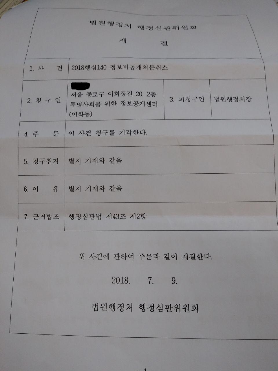 지난 주, 정보공개센터는 법원행정처 행정심판위원회로부터 '기각' 통지서를 받았습니다. 법원행정처가 '사법행정권 남용의혹 특별조사단 조사 대상인 파일 410개'에 대한 정보공개 청구에 대해 비공개 결정을 내린 것에 대해 정보비공개 처분을 취소해달라는 행정심판을 청구했었거든요. 그러나 행정심판위원회는 "공개될 경우 법원 내부 감사 기능과 활동에 지장을 초래"하며 "감사 업무의 독립성과 중립성이 저해"될 수 있다며 청구를 기각했습니다ㅠㅠ