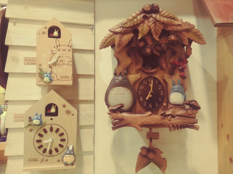 There are Totoro cuckoo clocks and other clocks.