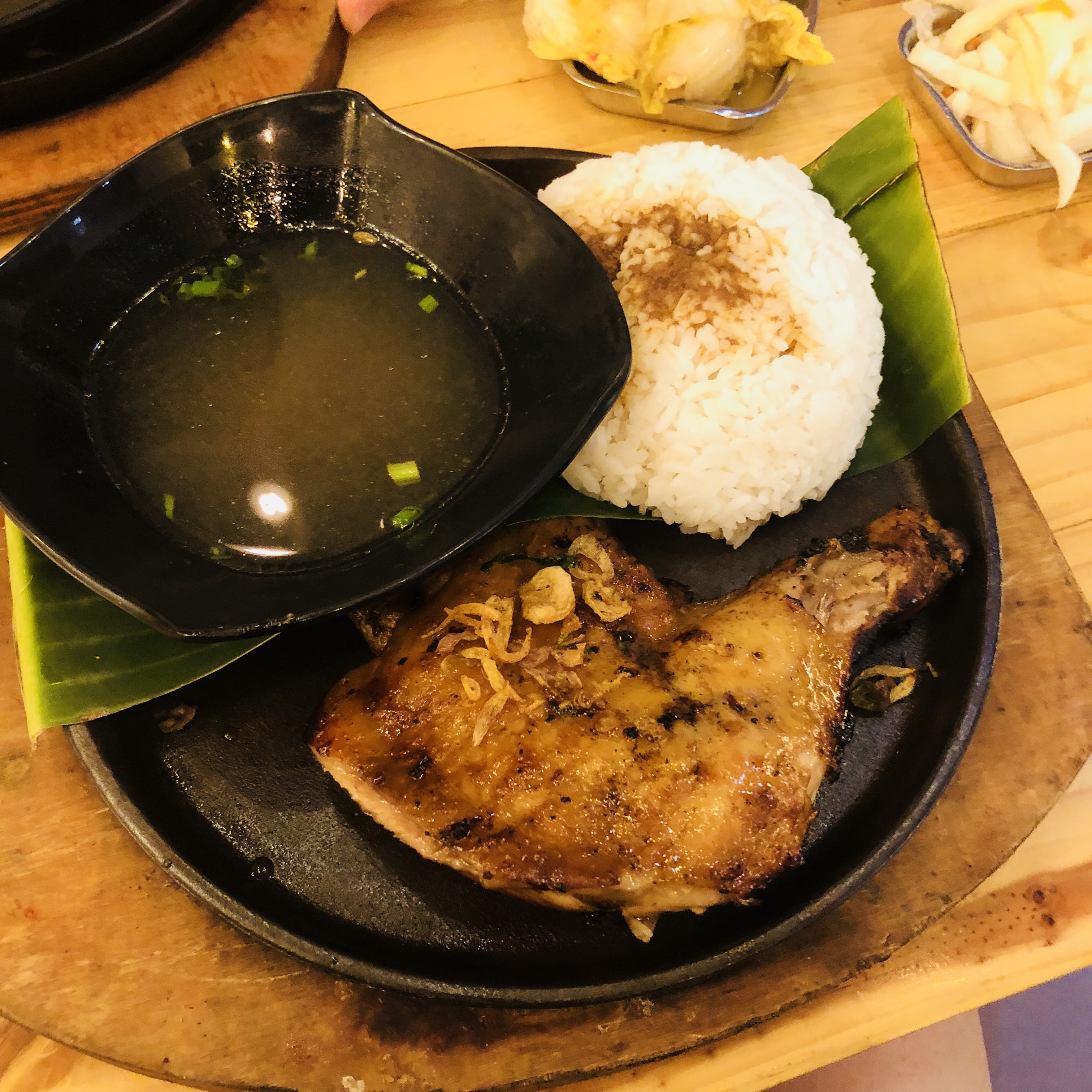 Big Chicken with rice and soup. Soup taste like a Pho's Soup