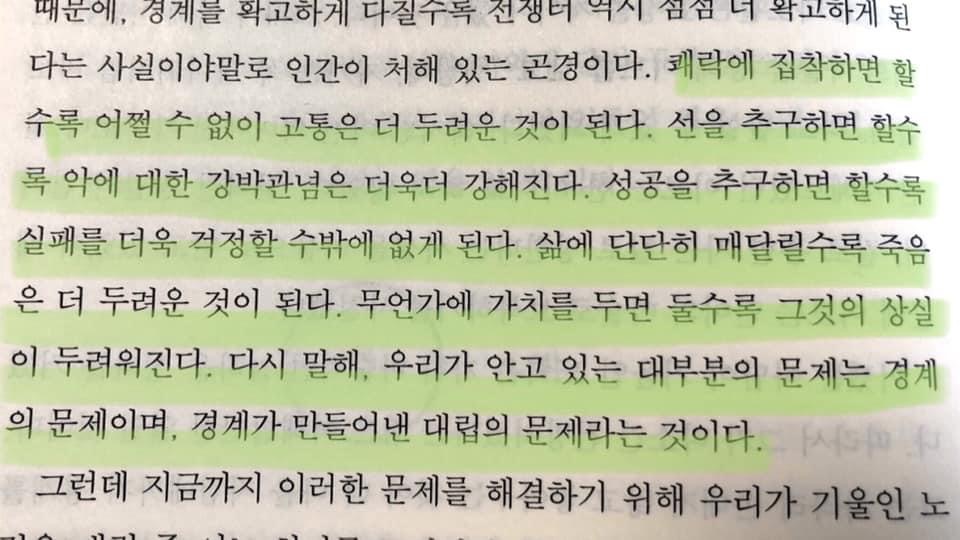 삶에 단단히 매달릴수록 죽음은 더 두려운 것이 된다.coachjin (58)in #kr • 5 years ago 쾌락에 집착하면 할수록 어쩔 수 없이 고통은 더 두려운 것이된다. 선을 추구하면 할수록 악에 대한 강박 관념은 더욱더 강해진다. 성공을 추구하면 할수록 실패를 더욱 걱정할 수밖에 없게된다. 삶에 단단히 매달릴수록 죽음은 더 두려운 것이 된다. 무언가에 가치를두면 둘수록 그것의 상실이 두려워진다. 다시 말해, 우리가 안고있는 대부분의 문제는 경계의 문제이며, 경계가 만들어 낸 대립의 문제라는 것이다.' ken wilber (no boundary) #life #coach