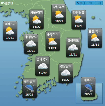 5일 : 구름많음 / 제주도, 전라남도 흐려져 비