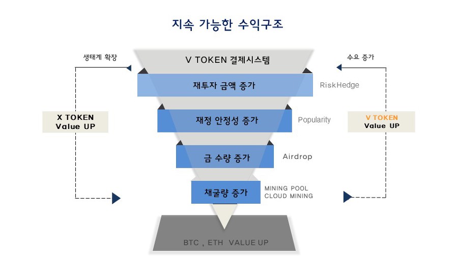 이렇게 순환되는 수익 구조 속에서 투자자들은 X토큰을 보유하고 있으면 본질적인 가치를 지닌 금 즉, V토큰을 지속적으로 받을 수 있는 겁니다. 이 생태계가 지속되고 성공적이라면 단순히 변동 폭이 너무 크고 거래 속도가 느린 기존의 가상화폐에서 벗어나 실제 본질적인 화폐의 역할 또한 가능할 것이라는 판단이 듭니다. 실제로 가상화폐로 구매를 꺼려하는 업체와 일반 소비자들에 대한 문제도 덩달아 해결할 수 있을 것 같습니다.