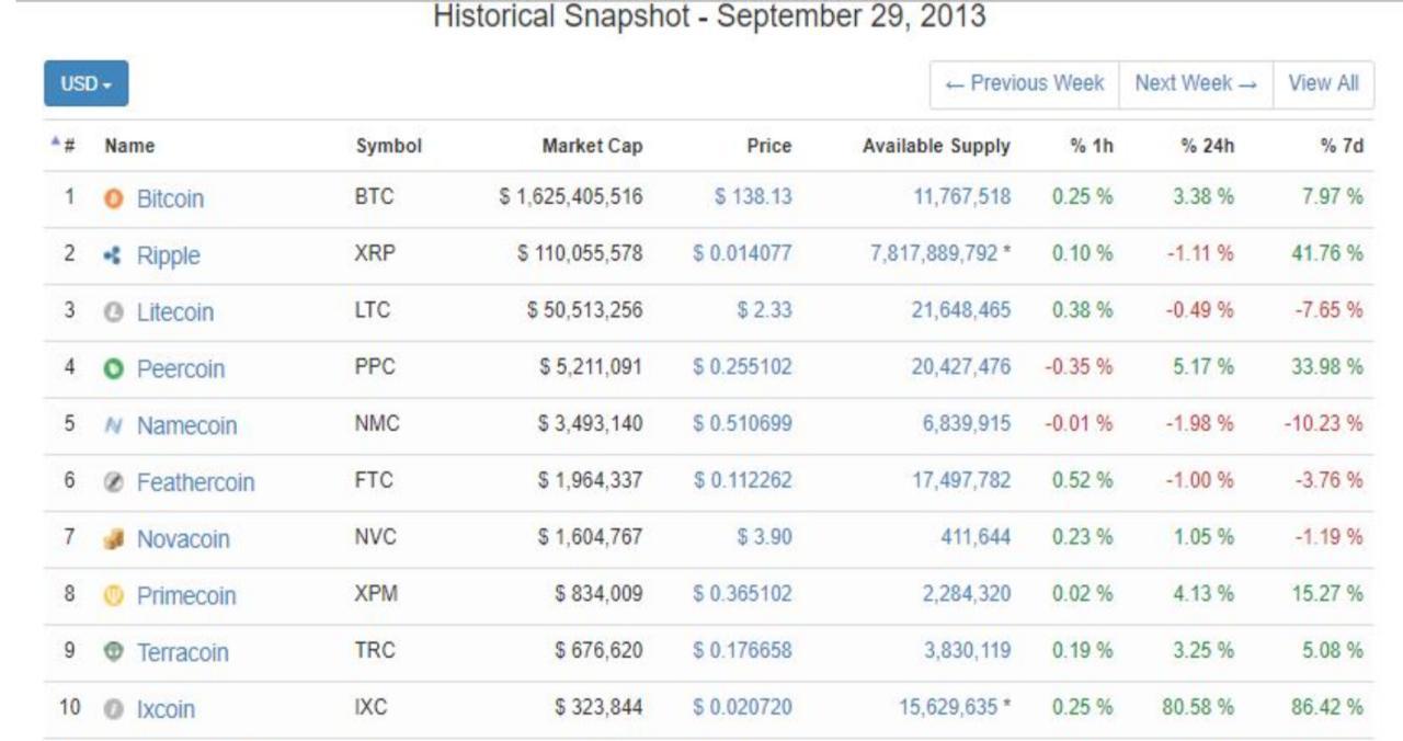 현재는 찾아볼 수 없는 시총 상위권의 코인들. (2013년 코인마켓캡)