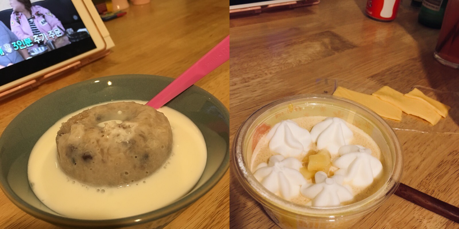 팥빙수에는 우유 부어서 섞어먹고, 오른쪽 사진은 망고빙수를 팔길래 한번 사먹어봤는데
