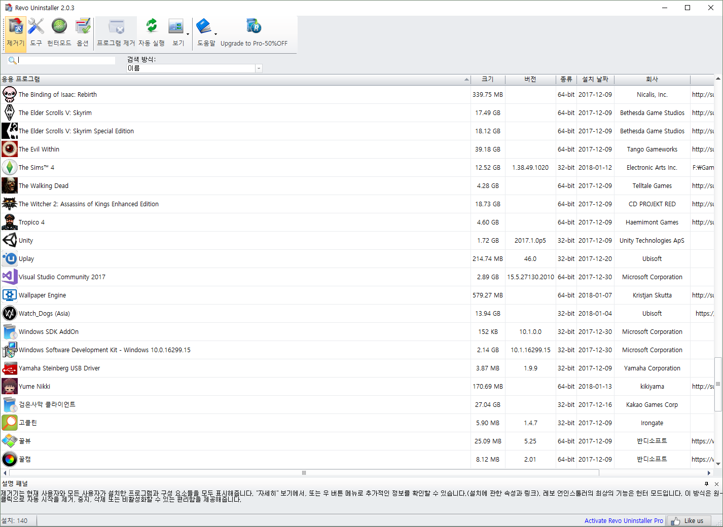 일단 메인화면은 윈도우 프로그램 추가/제거와 크게 다르지 않은 모습이다. 설치된 프로그램들의 이름과 정보들이 나열돼있다.