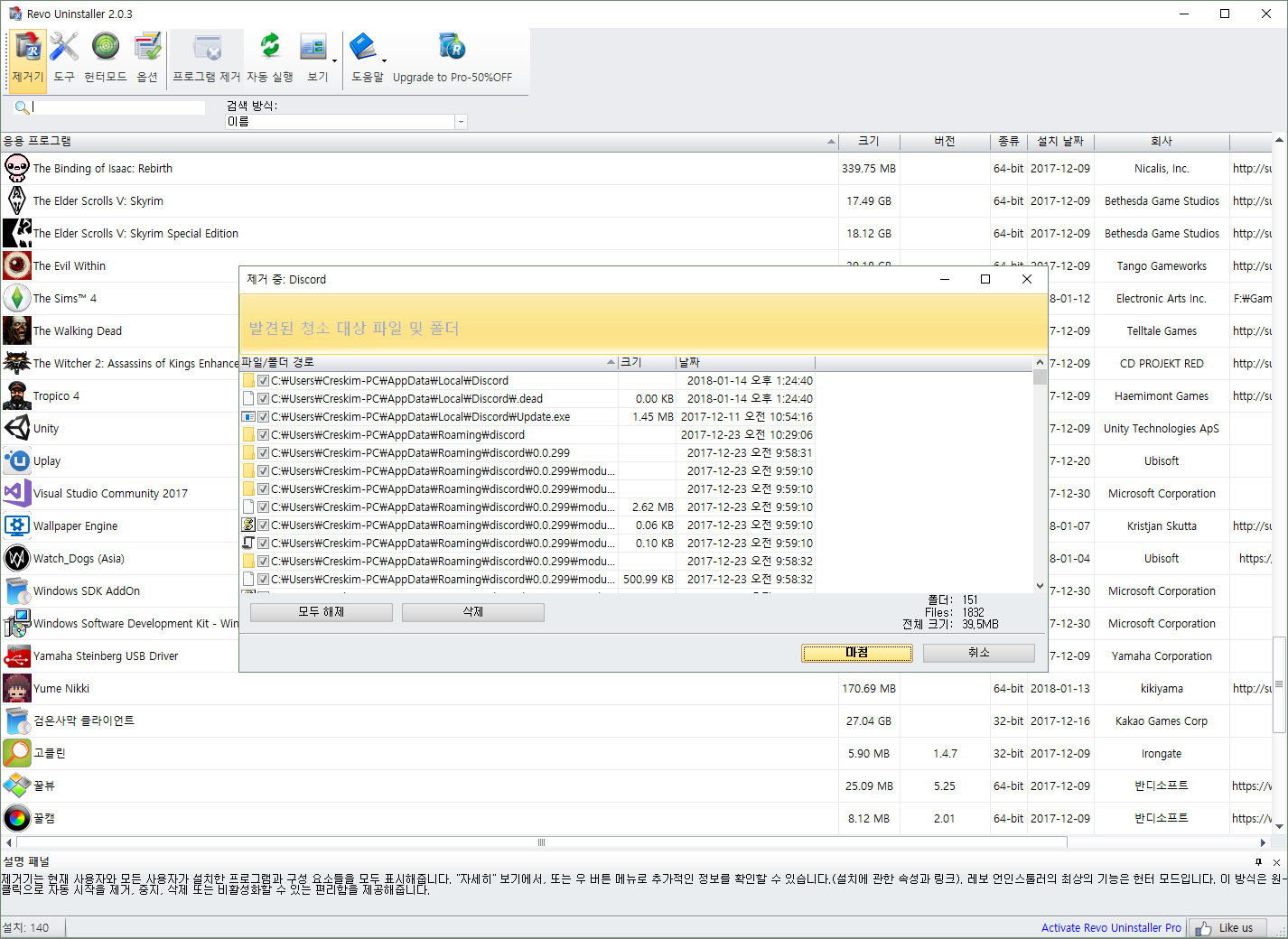 이렇게 수많은 찌꺼기 파일이 검색된다. 만약 그냥 제어판으로만 삭제했으면 컴퓨터에 남아있을 데이터들이다.