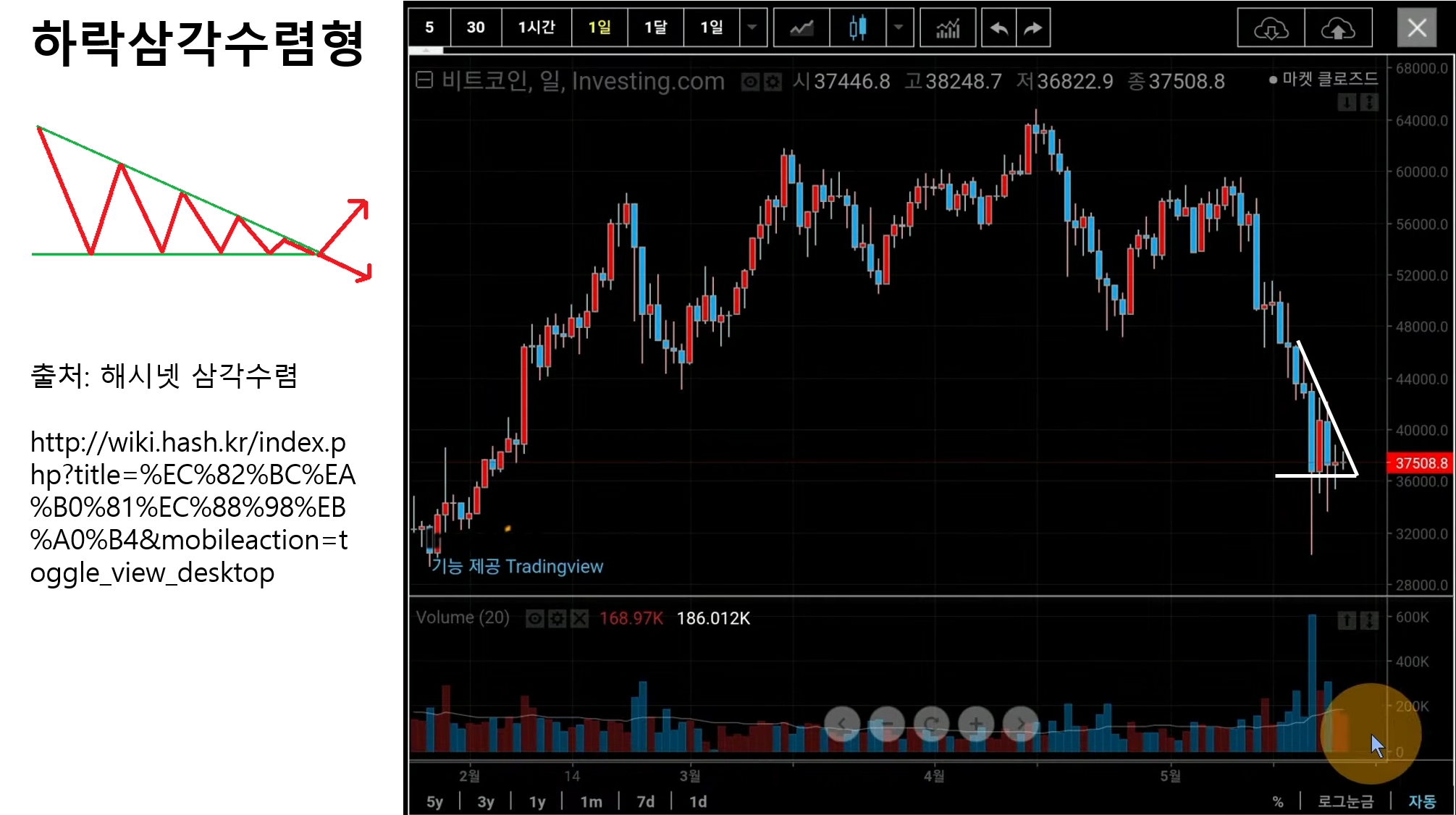 오늘 5월 23일 오전에 비트코인에 하락 삼각수렴 형태가 나타났다고 합니다. 이게 무슨 말이냐 하면 향후 비트코인의 폭락이 예상된다는 의미입니다.
