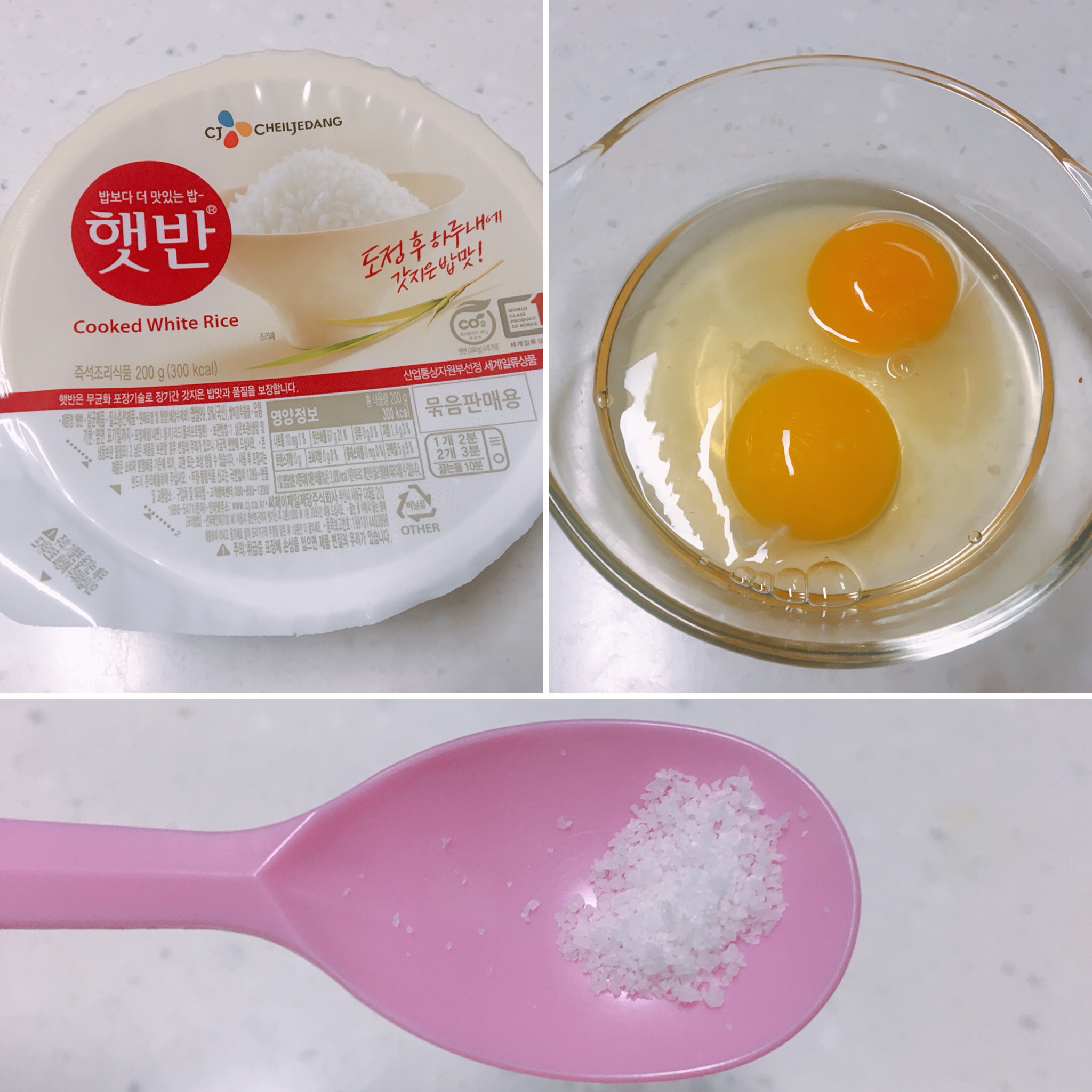 준비물 : 햇반, 버터조금, 계란2개, 물(계란과1:1부피), 소금 조금, 간장 조금