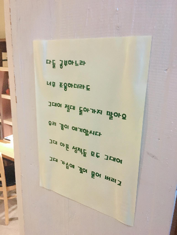 이 곳 테이블에는 수제작 메뉴판과 더불어, 노트들이 있다. 노트에는 이곳을 방문한 이들의 방명록이 있다. 방명록에는 여러 사람들의 고민, 생각들이 고스란히 남아있다. '아무 말'도 있고 그림도 있고, 넋두리도 있고, 시도 있고, 근황을 적은 일기도 있다. 취업을 걱정하는 대학생의 고민도, 한창 행복한 시간을 보내는 커플들의 사랑의 말들도. 말하자면 여러 감정의 아카이브다. 서가 한 켠에 몇년이 지난 것도 보관되어있다. 나는 나보다 먼저 이곳을 다녀간 이들의 생각을 몇 시간이고 읽었다.