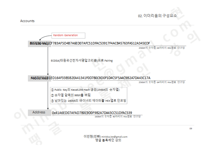 위 사진은 계정이 어떻게 만들어지냐에 대한 내용입니다. 먼저 랜덤으로 개인키가 생성된 후, 타원곡선알고리즘으로 public key가 생성됩니다. public key를 또 해당 알고리즘을 통해 address가 나오게 됩니다. 지갑 주소가 생성된 것 입니다!