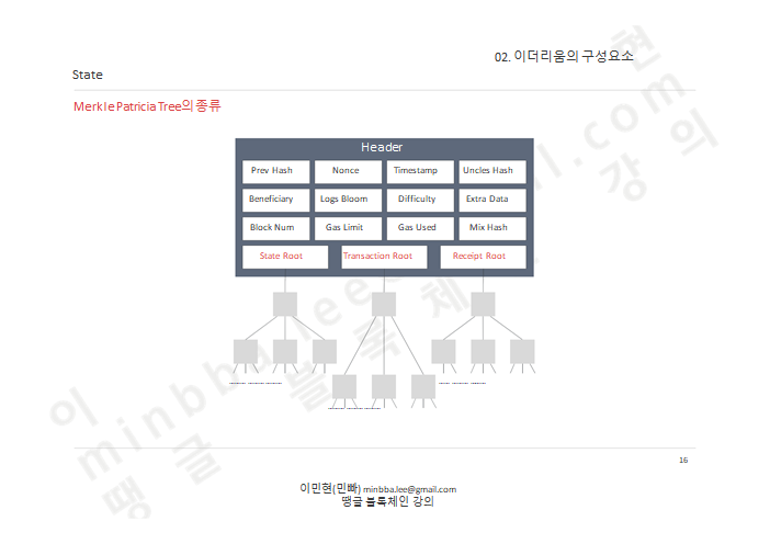 머클 패트리샤 구조는 거의 이더리움 root 값에 다 활용됩니다. State Root, Transaction Root, Receipt Root 등이 머클 패트리샤 구조를 통한 루트 값을 저장하고 있습니다.