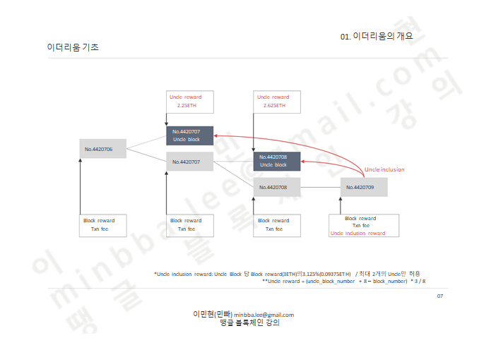 채굴 과정에서 블록의 처리에 따라 uncle 블록이 생깁니다. uncle 블록은 블록 생성 과정 중 블록 수가 부족해서 낙오되는 uncle 블록입니다. (즉, 메인 체인에서 인정받지 못하는 블록) uncle 블록도 간만의 차로 uncle 블록이 된 것이기 때문에 보상을 받습니다. 이더리움에서는 한 블록에 uncle 블록을 2개까지 허용합니다. uncle 해시가 있어서 uncle 블록들을 담습니다. uncle inclusion을 한 블록은 uncle을 include 했다고 대가를 받습니다. uncle은 8세대까지 가능하다고 합니다. 또한, uncle의 uncle은 불가능합니다.