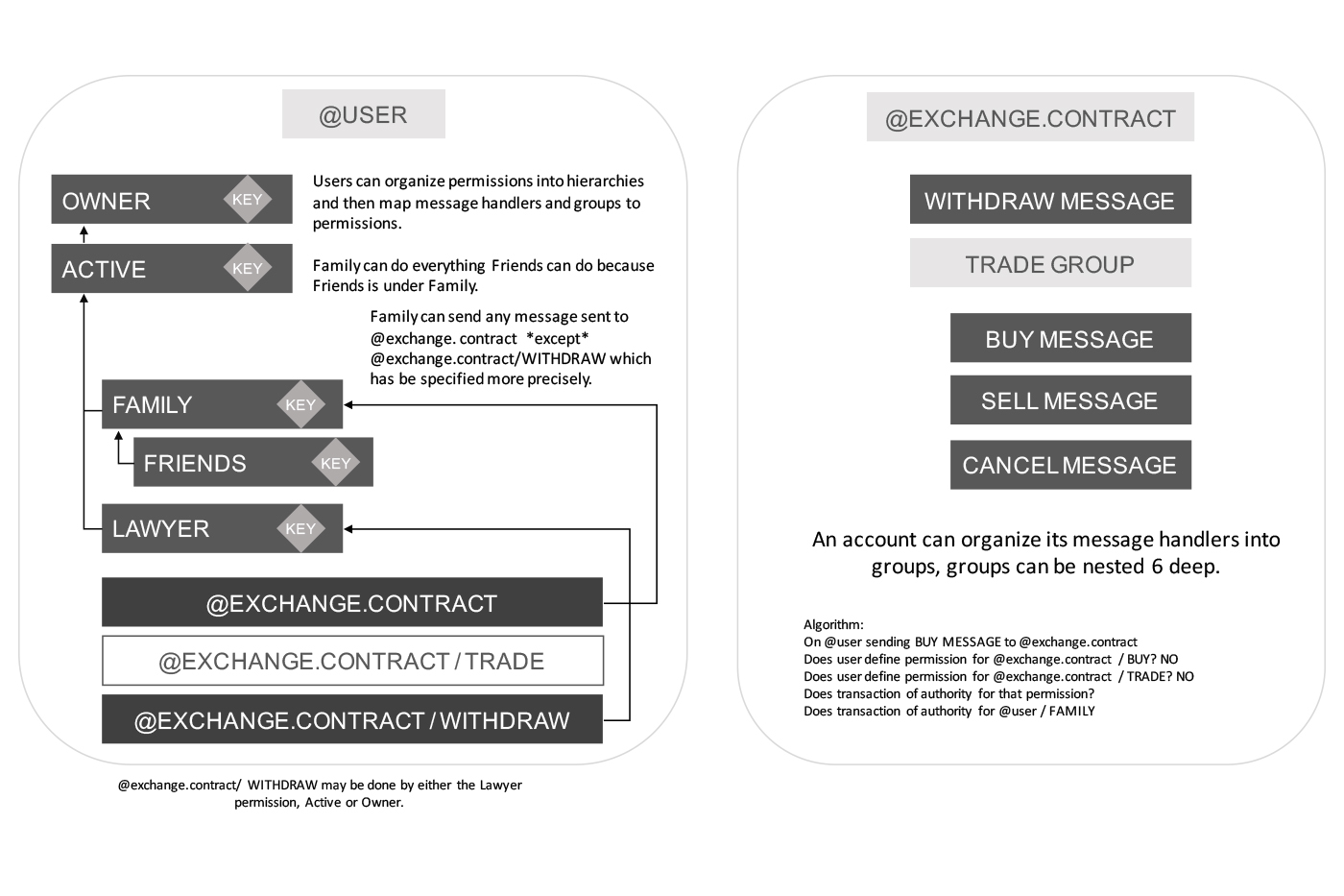 EOS에도 마찬가지로 한 계정을 한 사람만이 쓰는 게 아니라 여러 사람이 쓸 수 있도록 해놓았습니다. 사용자 지정으로 액션을 정의하고 이 액션은 어떤 권한을 가진 사람만이 할 수 있게 지정해놓았습니다. 모든 계정은 다른 계정과 개인키들의 가중치 조합으로 제어할 수 있습니다. 권한들은 그룹화를 할 수 있습니다. 예를 들어, '친구' 권한 그룹에 만들어 이 그룹에 있는 계정들은 나의 계정을 가지고 글을 쓰거나 할 수 있는 역할을 할 수 있습니다. 그리고 모든 것들은 기록이 되기 때문에 누가 어떤 권한으로 언제 무엇을 했는지 알 수 있습니다.