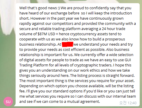 보시는 바와 같이 커뮤니티내에서 매니저인 저에게 따로 연락을 해서, 너네 코인을 하루 평균 8,700만불 정도에 거래가 이뤄지는 우리 거래소에 상장 했으면 한다. 자기는 코인 리스팅 사업부에 디렉터로써 일하고 있고 BTC, ETH, USDT 중 어떤 마켓에 오픈할건지 또 마케팅 서비스도 같이 사용할 건지 등에 여부에 따라 리스팅 가격을 옵션별로 나누어서 제공한다고 제안 하였습니다.