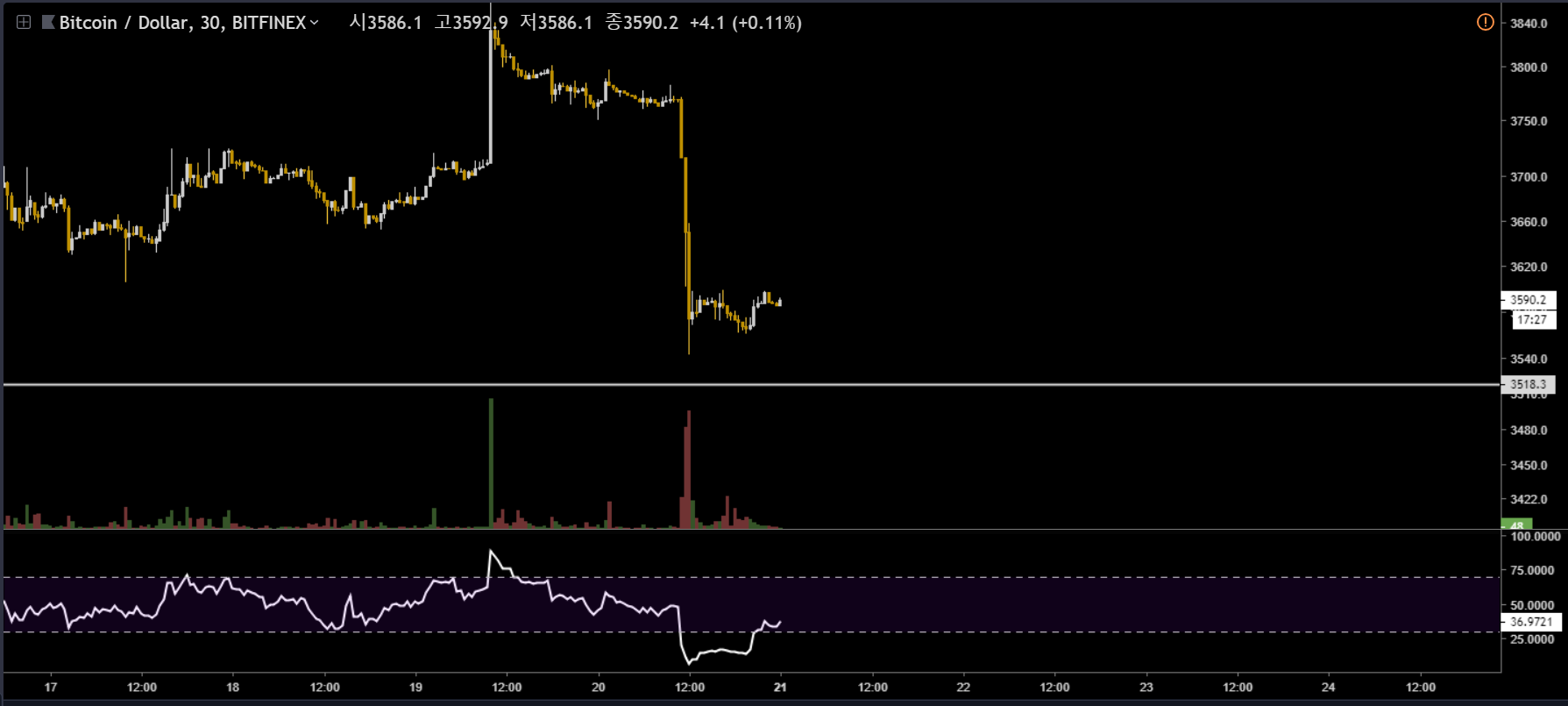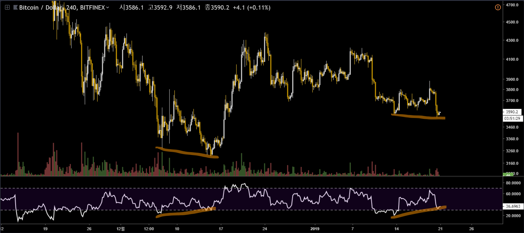 190121 비트코인 차트deadcatbounce (52)in #kr • 7 years ago AB=CD 비율자리까지 아주 조금 더 여유가 있습니다 과매도/과매수를 벗어나며 만들어지는 다이버전스는 신뢰도가 비교적 높습니다 조금더 단기시그널에 주목하게되는데 가격이 소폭 더 내려주며, 패턴 비율자리 근방에서 지지받는다면 작은봉에서도 다이버전스가 만들어지게되며 좋은 매수타점이 다시한번 발생하게 됩니다. #bitcoin #cryptocurrency