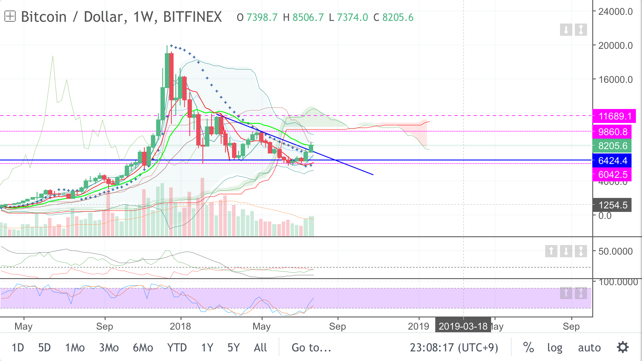 이제는 중기간 이상을 목표로 하는 투자자들은 7600 달러를 지키는 이상 손절하는 일은 앖어야겠습니다 ㅎㅎ 이번 상승 랠리는 1주일봉으로 보면 확실히 11000달러를 도전하러 가는 모습을 보여주고 있습니다.