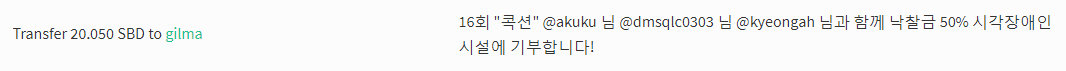 낙찰되셔서 20.05 SBD 기부완료!- 17회차 콕션 @gumagreat 님 낙찰되셔서 1.05 SBD 기부완료!