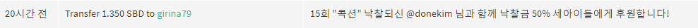- 19회차 콕션 @donekim 님 낙찰되셔서 1.05 SBD 기부완료!