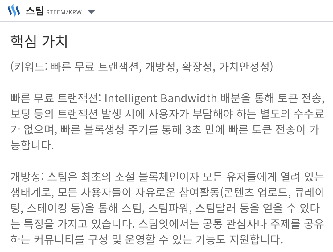 확장성: 개발자들의 경우 빠른 TPS와 Steemit.com에서 활동하고 있는 대규모의 활성유저를 기반으로 한 다양한 디앱들을 개발할 수 있으며, 나만의 커뮤니티를 운영하고 싶은 운영자들은 스팀 커뮤니티스 기능을 통해 자신만의 커뮤니티를 구성하고 운영할 수 있습니다. 커뮤니티스 기능에 나만의 토큰을 만들어 인센티브 모델을 접목할 수 있는 SMT(Smart Media Token)이 현재 테스트넷 단계에 있습니다.