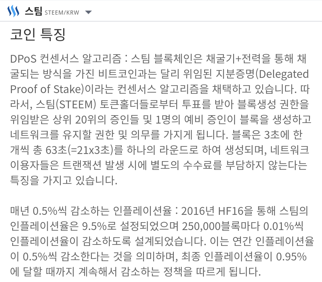 더불어 변경 전 내용과 변경 후 내용의 비교가 필요하신 분들을 위해서 변경 전 정보와 변경 후 정보의 원문을 다음과 같이 공유드립니다. 현재 STEEM이 상장되어 있는 다른 거래소들의 코인 정보도 보다 이해하기 쉽고 최신화된 정보로 지속적인 업데이트 작업을 진행할 예정입니다.