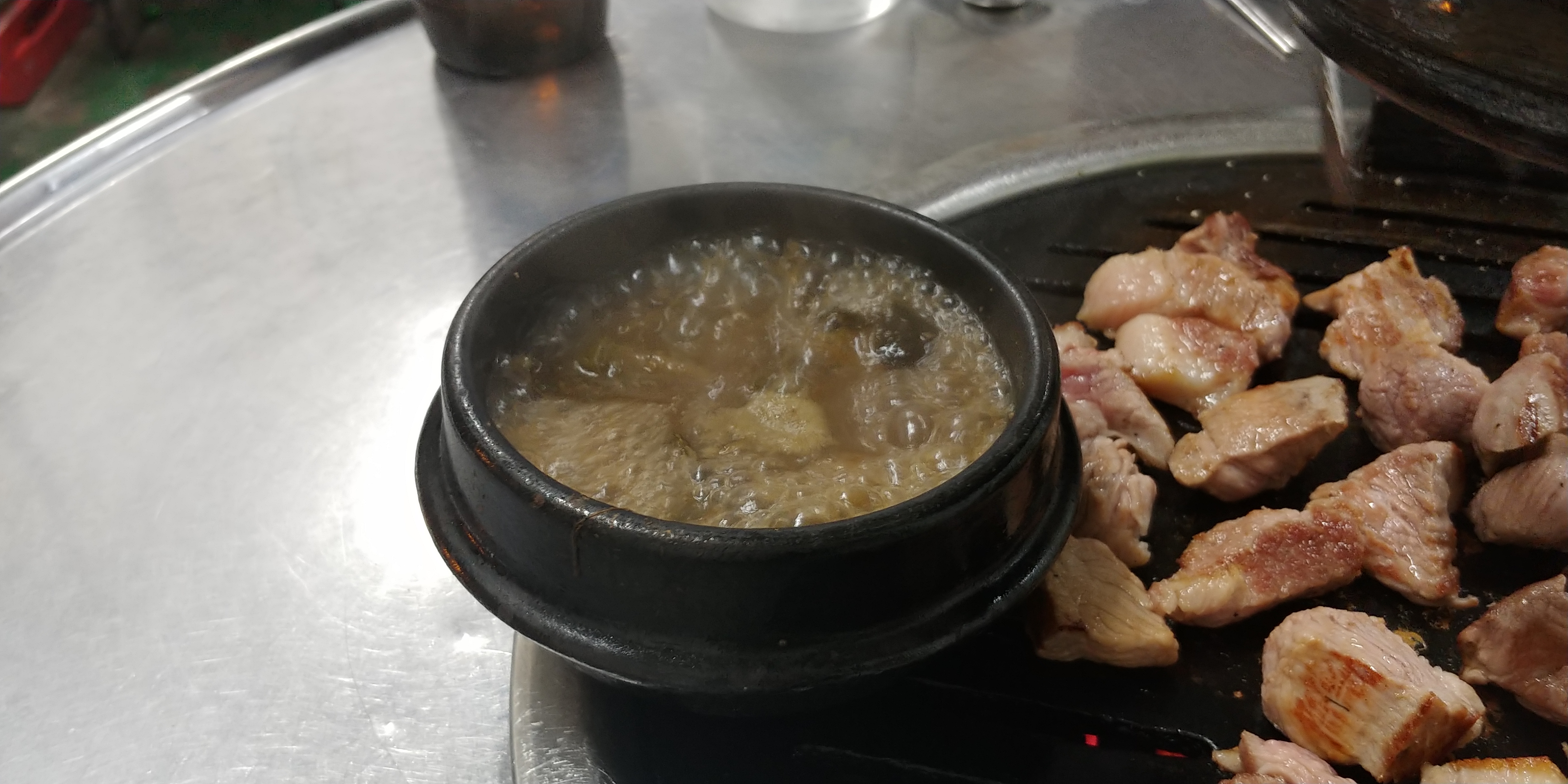 익은 고기 먹어보니 맛있습니다. 같이 간 지인도 글타는군요. 고기가 익어갈 때 쯤 집된장으로 끓인 된장찌개가 나옵니다. 찌개는 좀 짭니다. 물투입해서 희석시켰습니다. 사장님 몰래.. ㅎㅎㅎ
